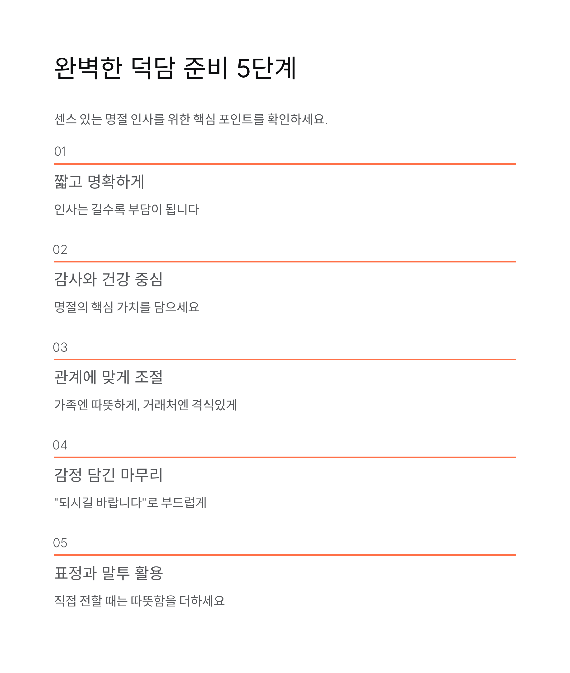 이 다섯 가지만 기억해도 센스 있는 덕담을 자연스럽게 전할 수 있습니다.