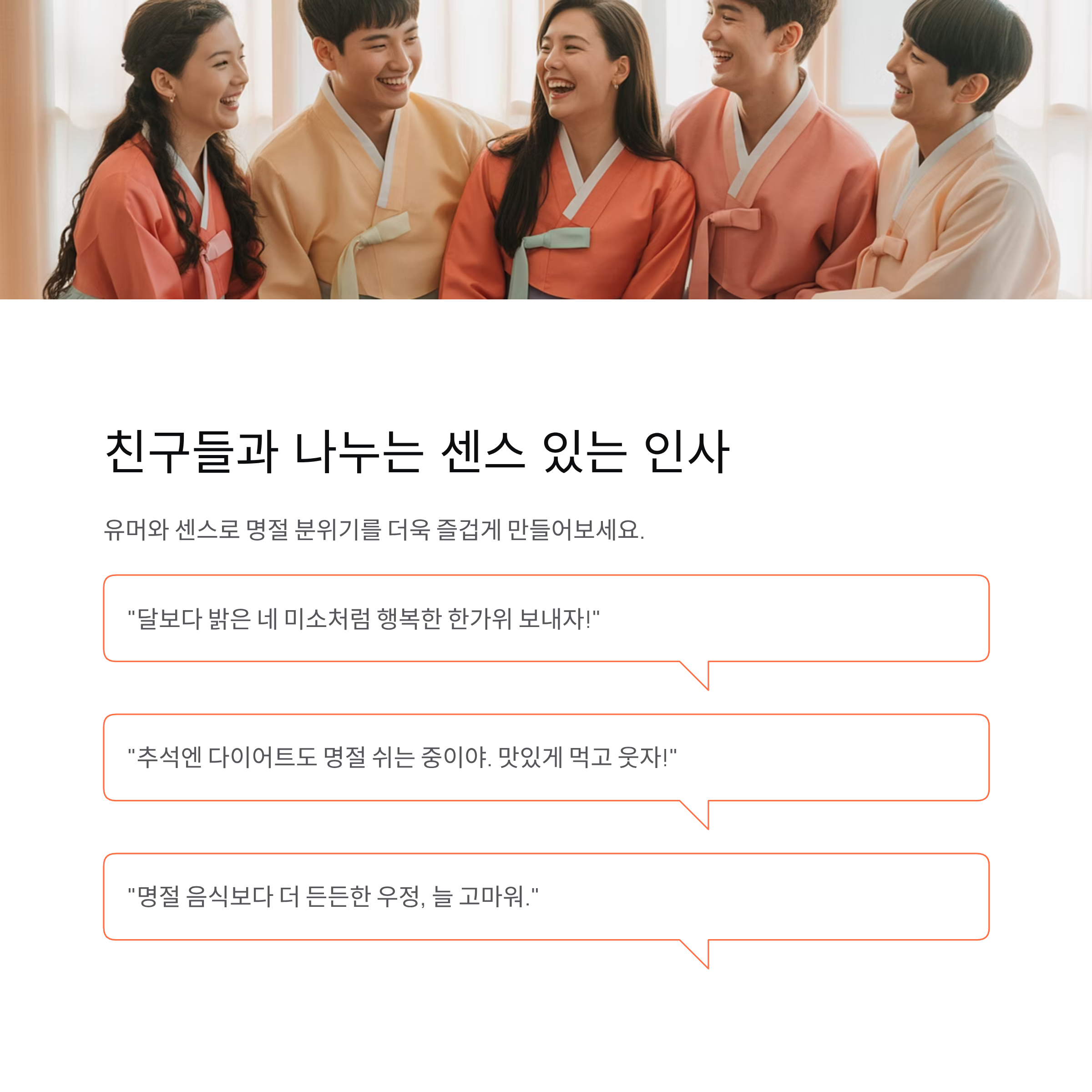 | 부모님 | “언제나 건강이 최고예요. 이번 명절엔 푹 쉬세요.” | 존중, 따뜻함 |