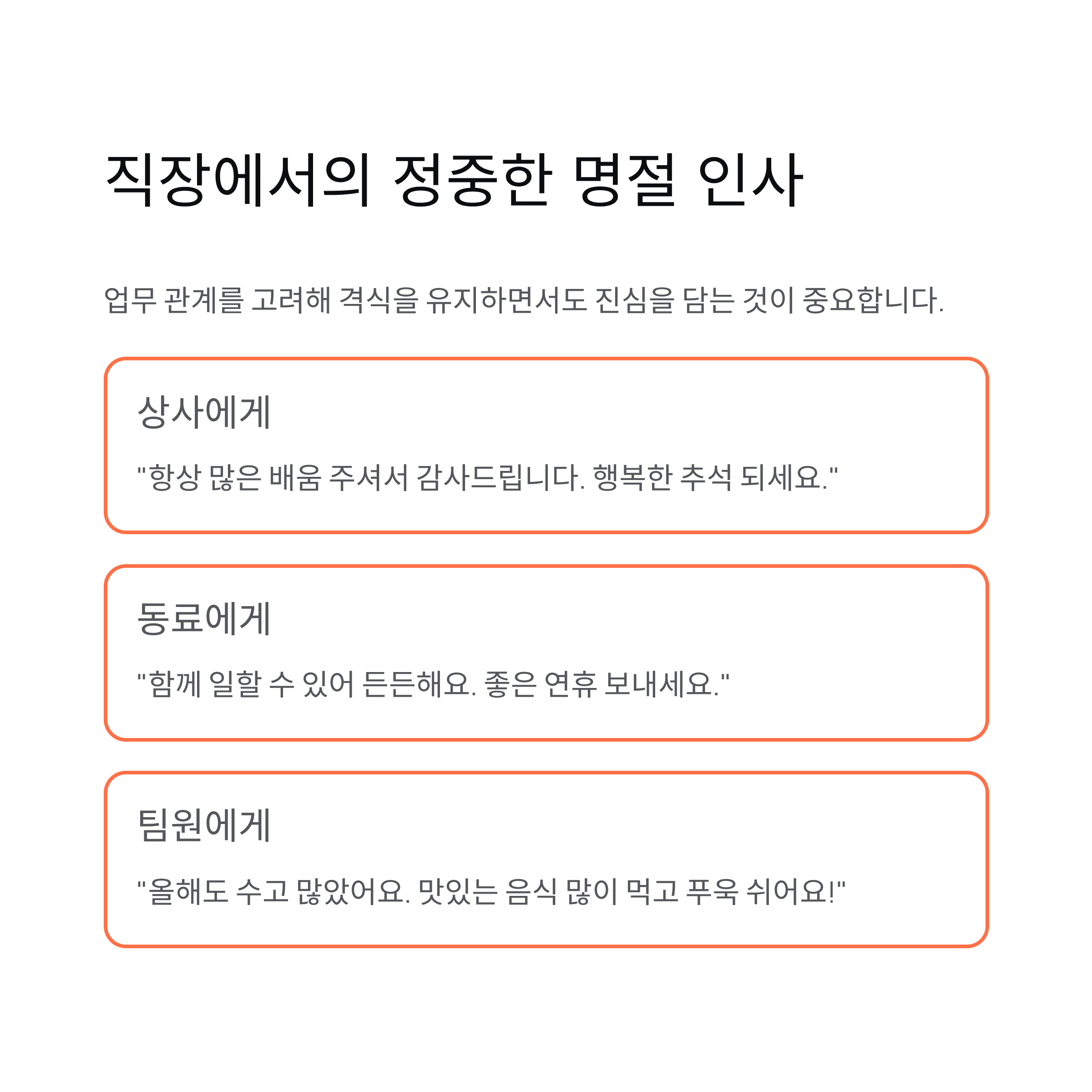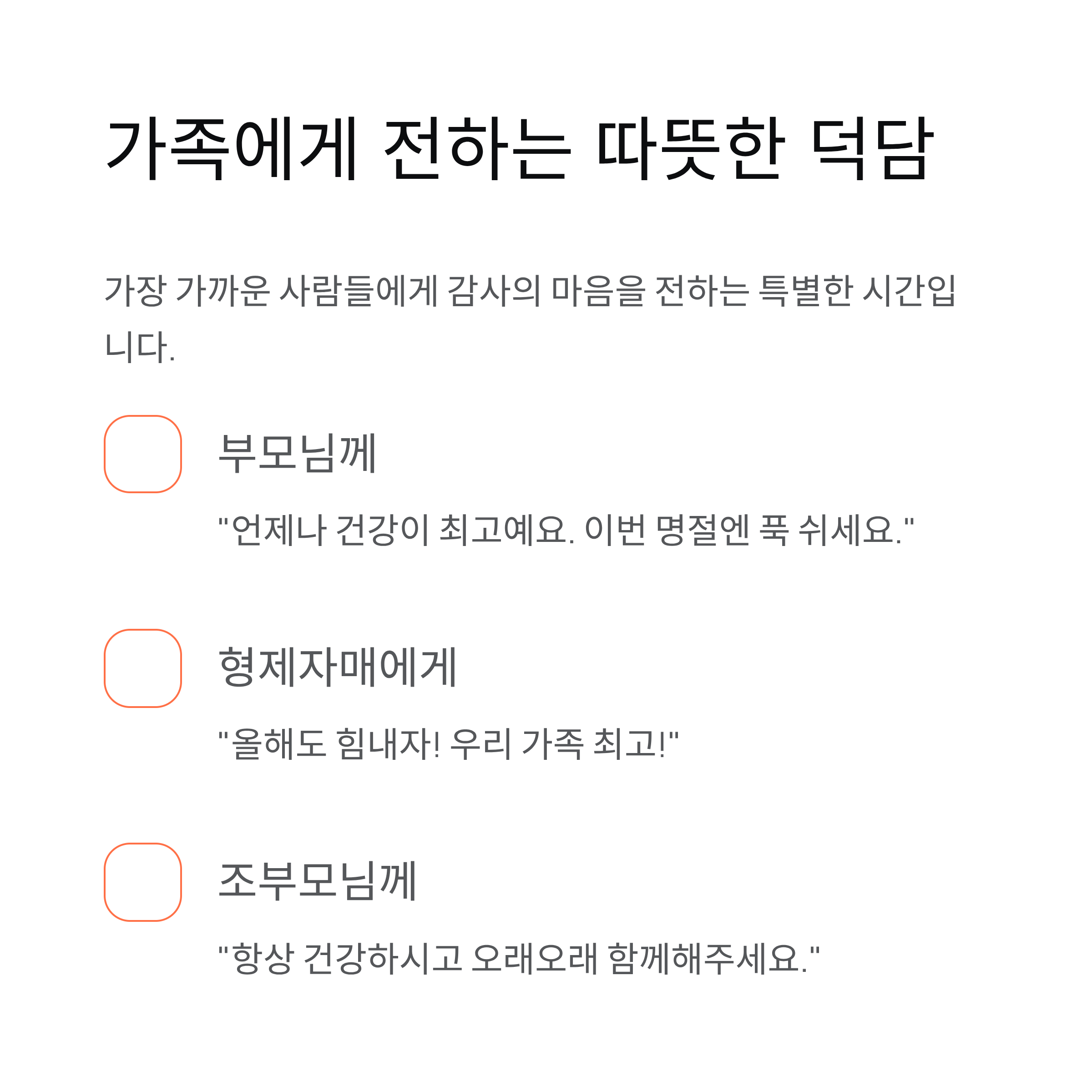 | 부모님 | “언제나 건강이 최고예요. 이번 명절엔 푹 쉬세요.” | 존중, 따뜻함 |