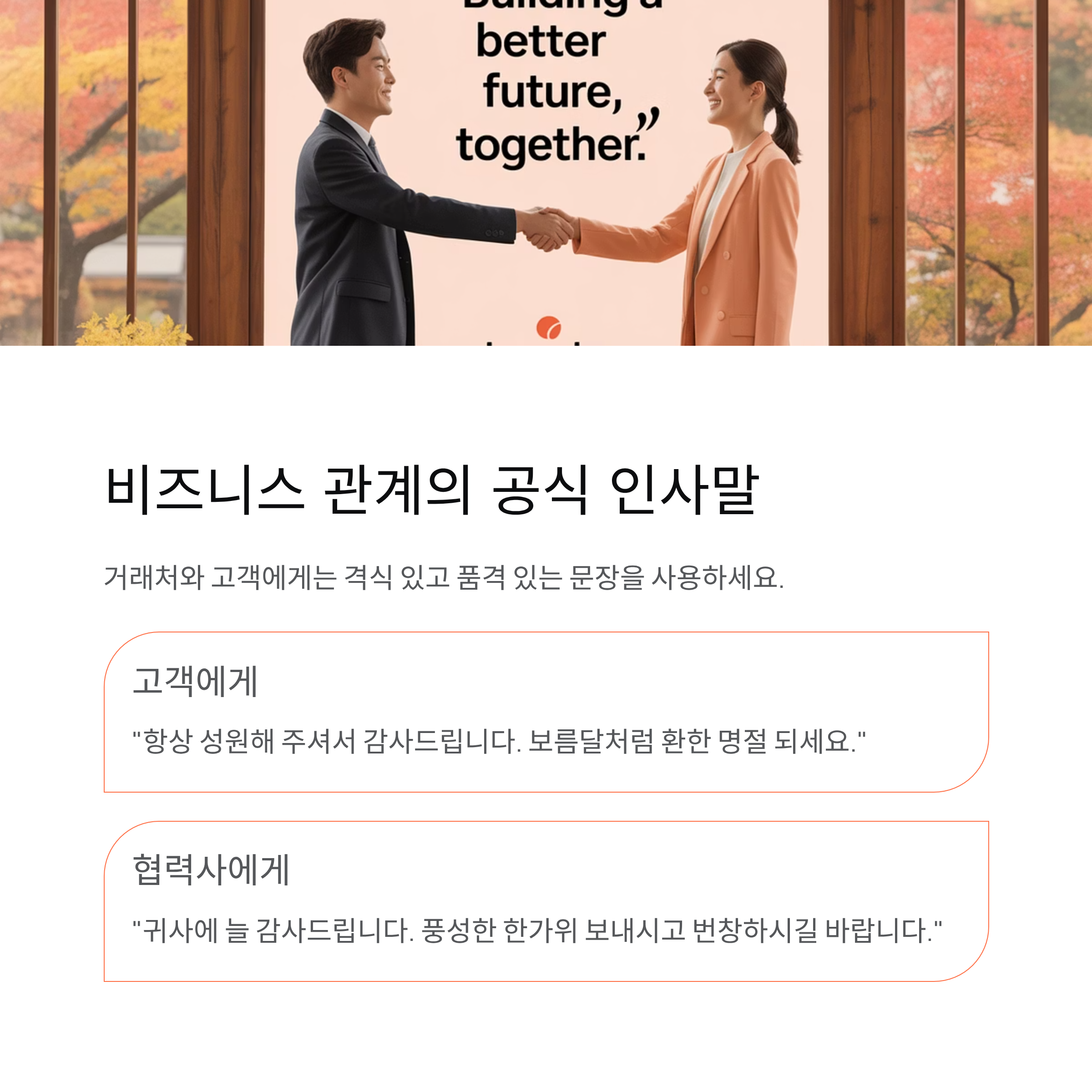 | 거래처 | “늘 감사드립니다. 풍성한 한가위 되세요.” | 고객, 협력사 |