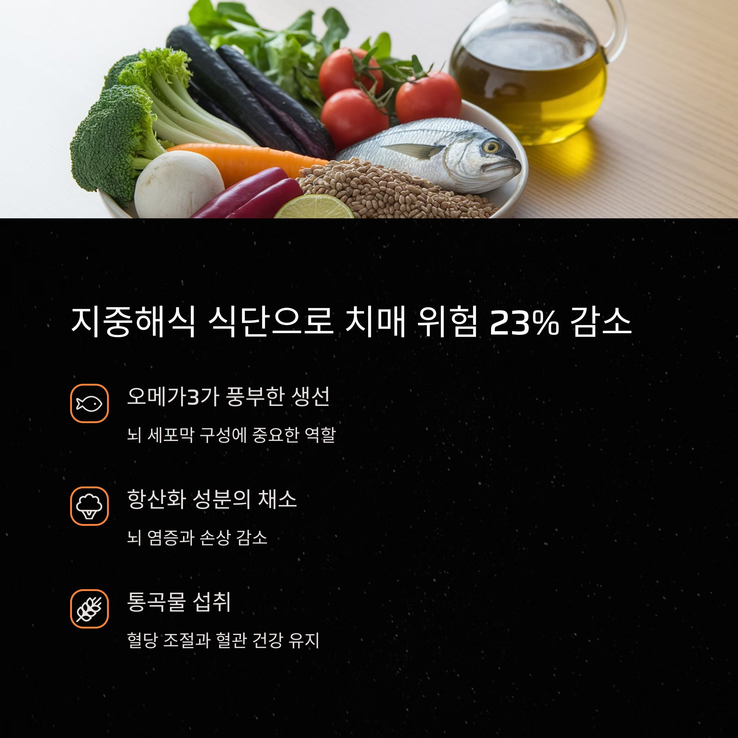 | 채소, 생선, 견과류, 저염식 위주로 섭취 | 글쓰기, 독서, 악기, 퍼즐, 외국어 | 수면, 스트레스 완화, 대화, 산책, 햇빛 |