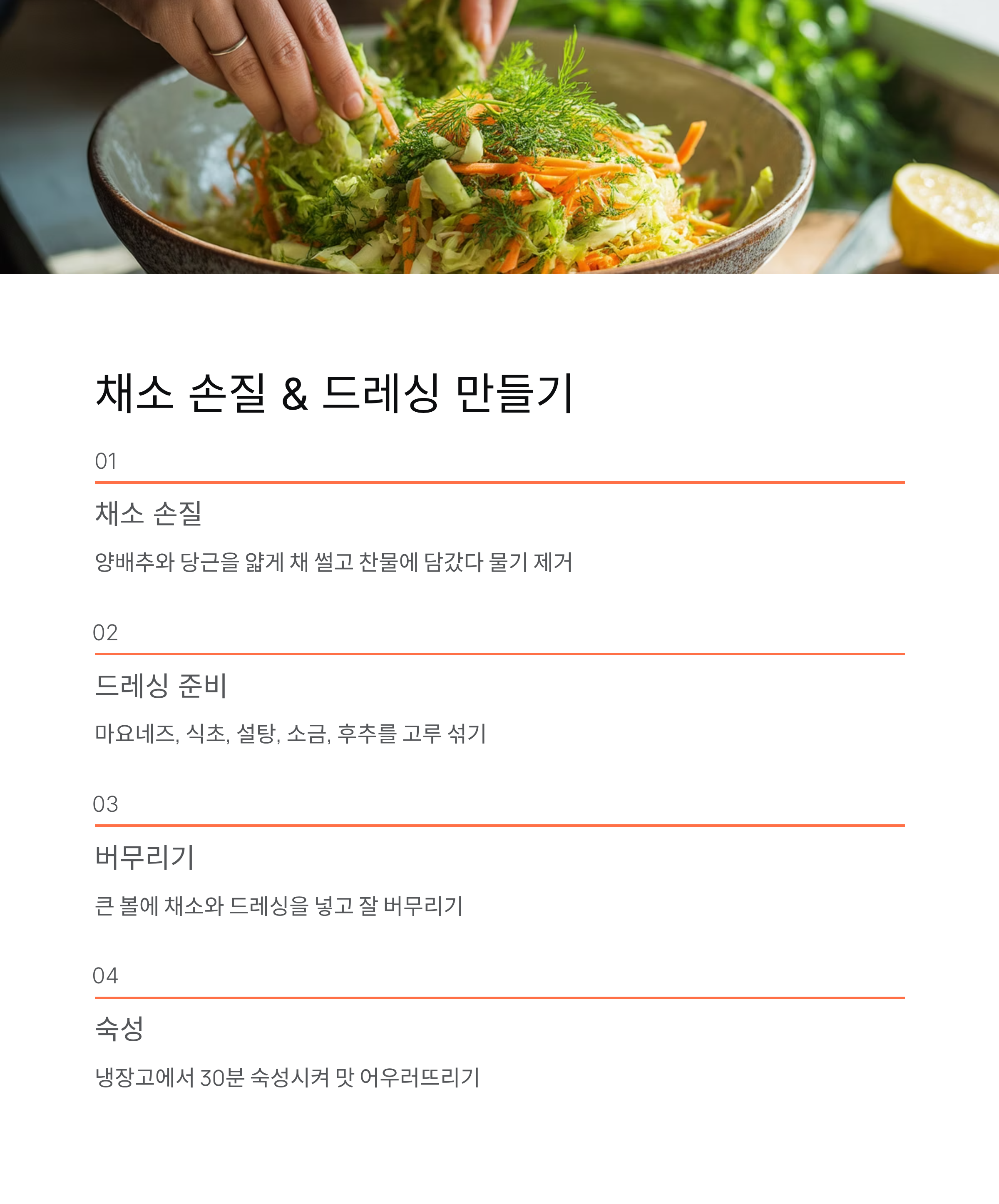 | 버무리기 | 채소와 드레싱 섞기 | 냉장 숙성 30분 |