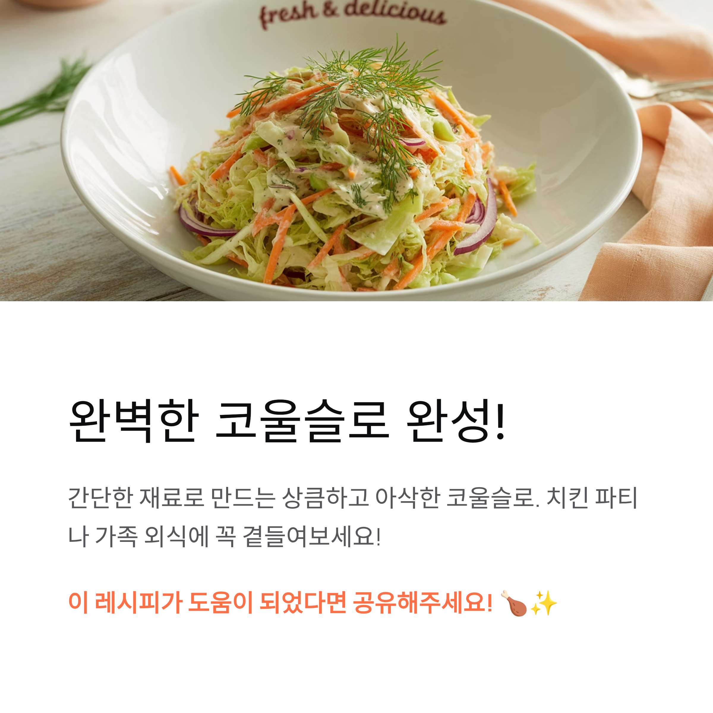 집에서도 쉽게 만들 수 있으니, 치킨 파티나 가족 외식에 코울슬로를 꼭 곁들여 보세요.