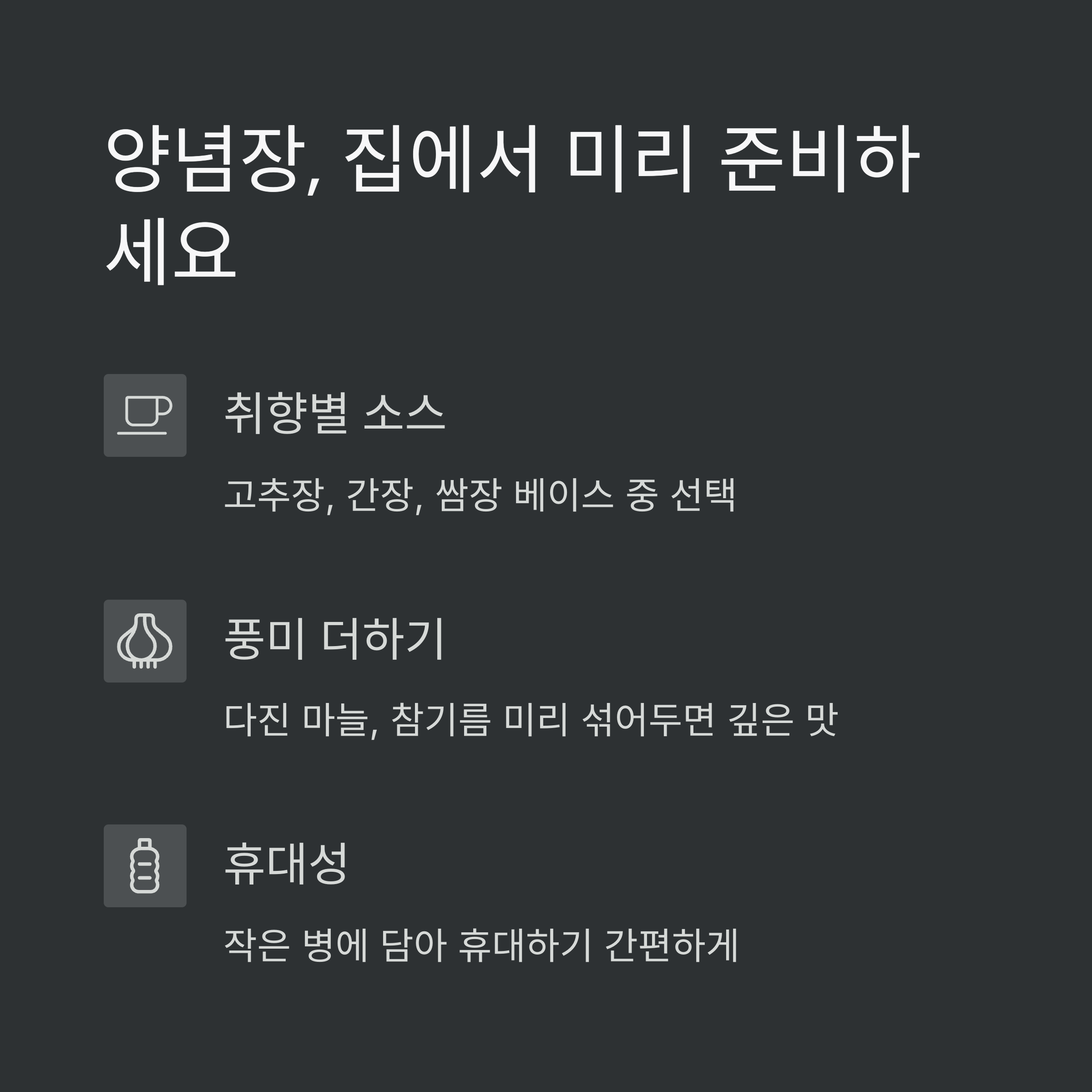 고추장 기반, 간장 기반, 쌈장 베이스 등 취향에 따라 소스를 1~2가지 만들어오면