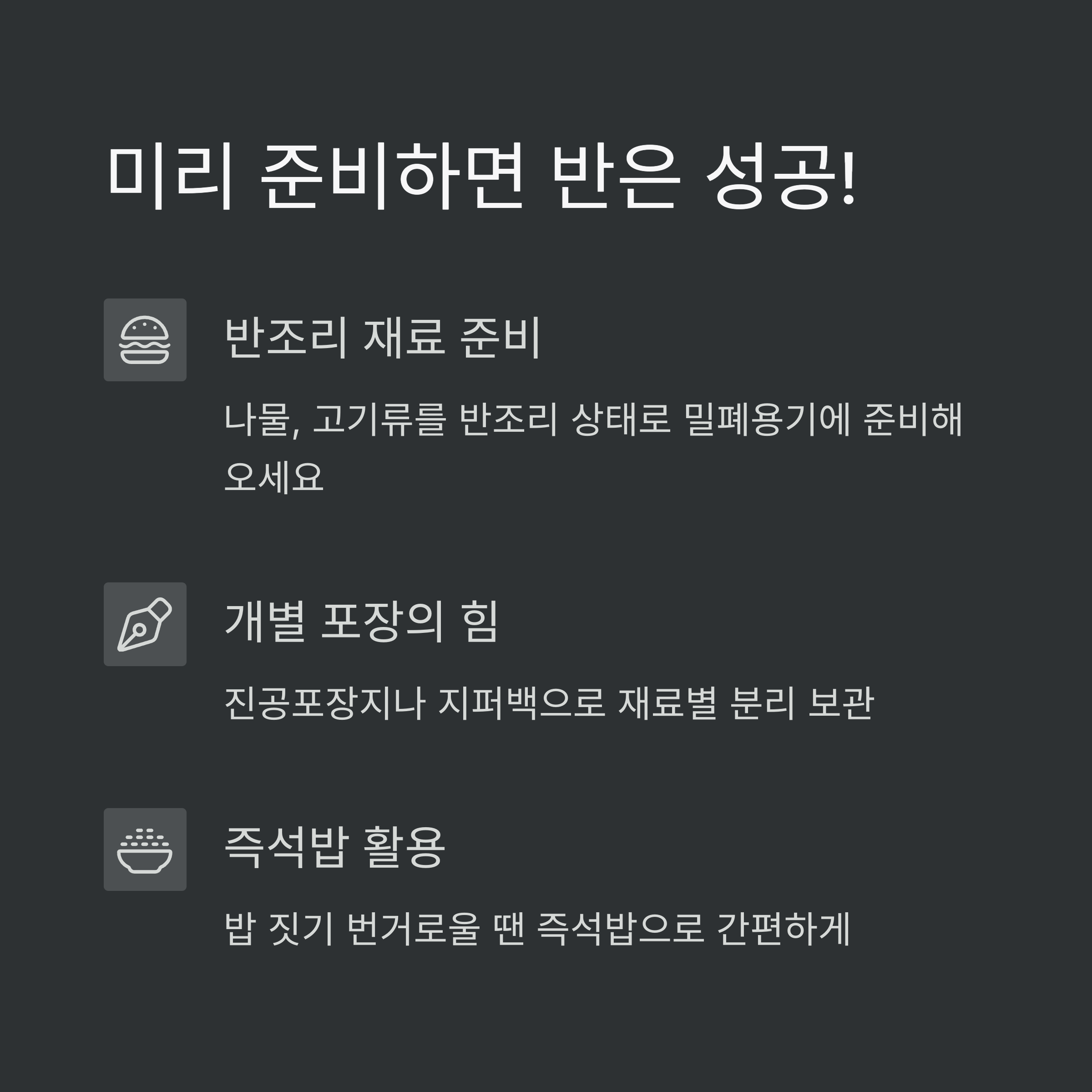 집에서 미리 나물, 고기, 볶음류를 반조리 상태로 준비해 밀폐 용기에 보관하면