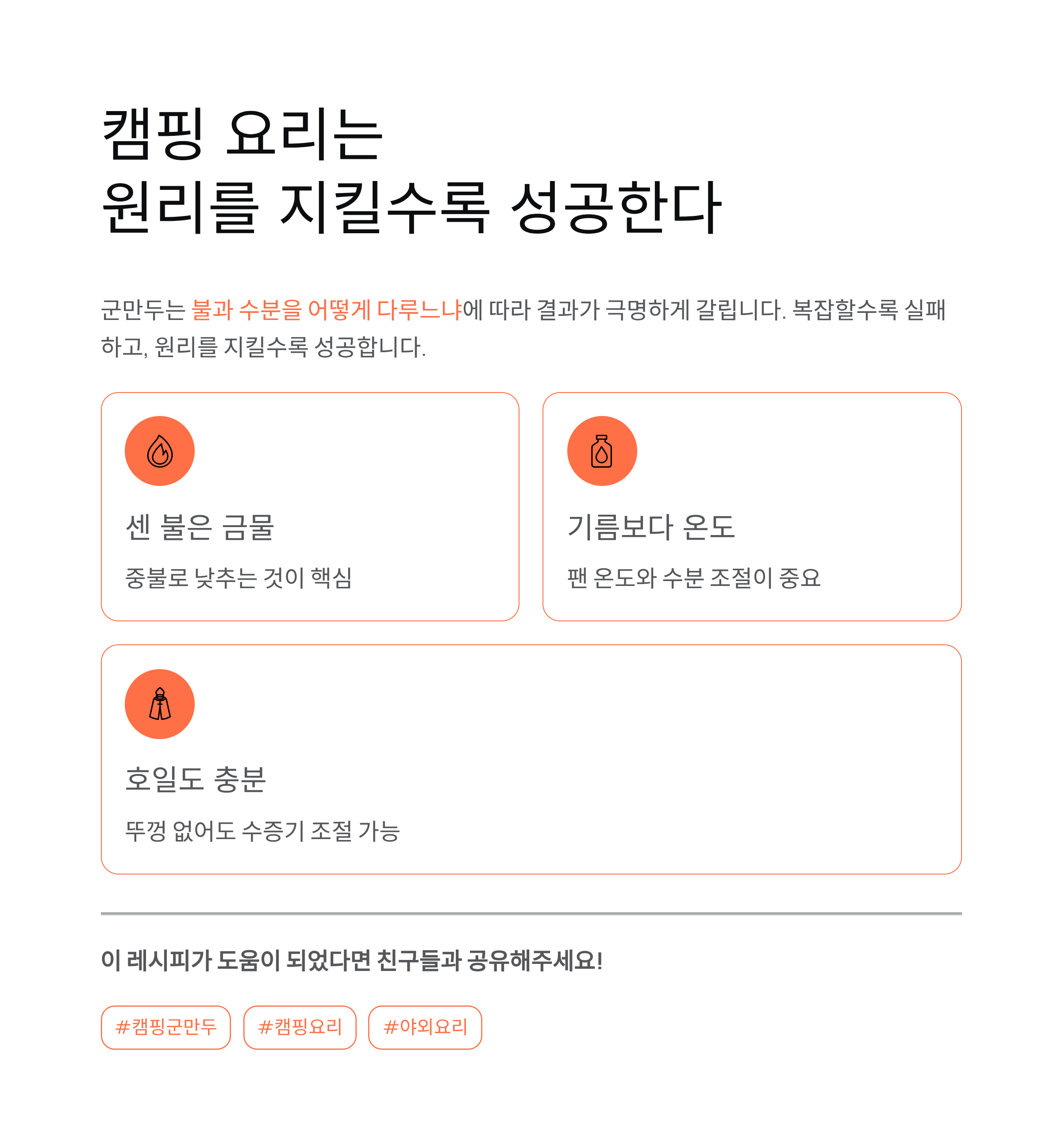 이 흐름은 불이 일정하지 않은 캠핑 환경에서도 가장 재현성이 높은 방식입니다.