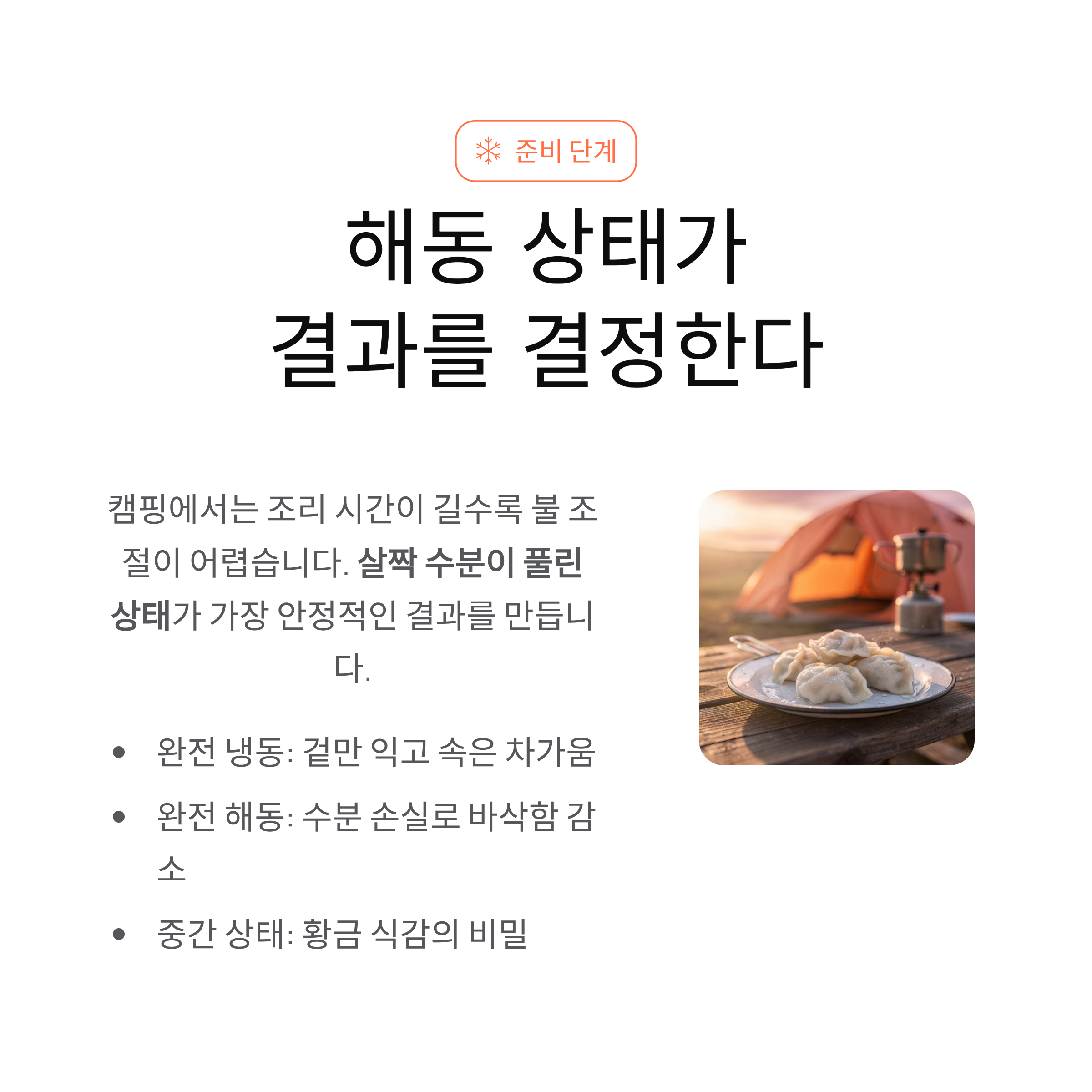 | 준비 | 살짝 해동 | 수분 균형 유지 |