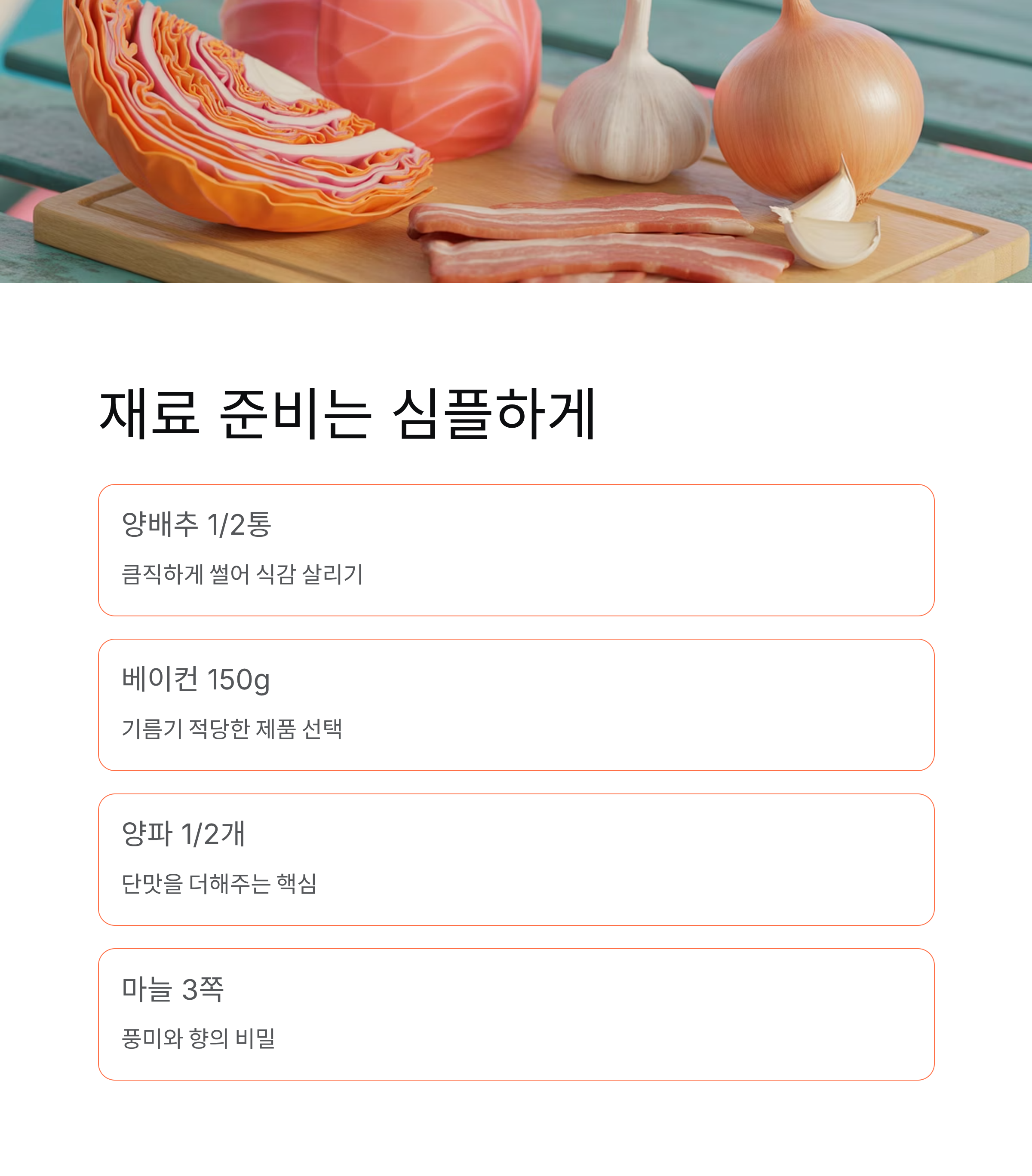 지금부터 캠핑장에서 누구나 쉽게 만들 수 있는 양배추 베이컨 볶음의 꿀팁과 황금 비율 레시피를 소개합니다.