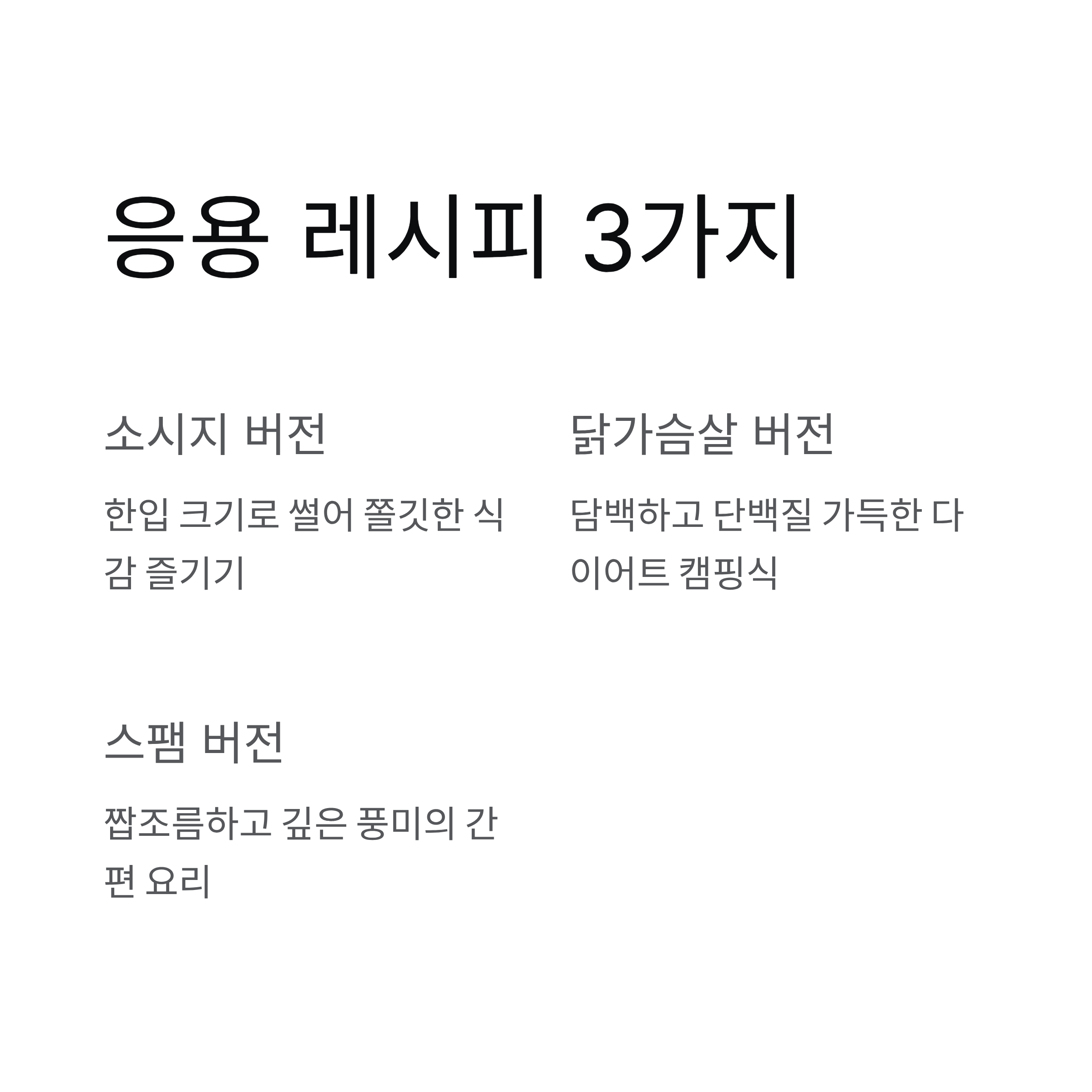 소시지, 닭가슴살, 스팸 등으로 대체하면 각자 다른 맛을 즐길 수 있어요.