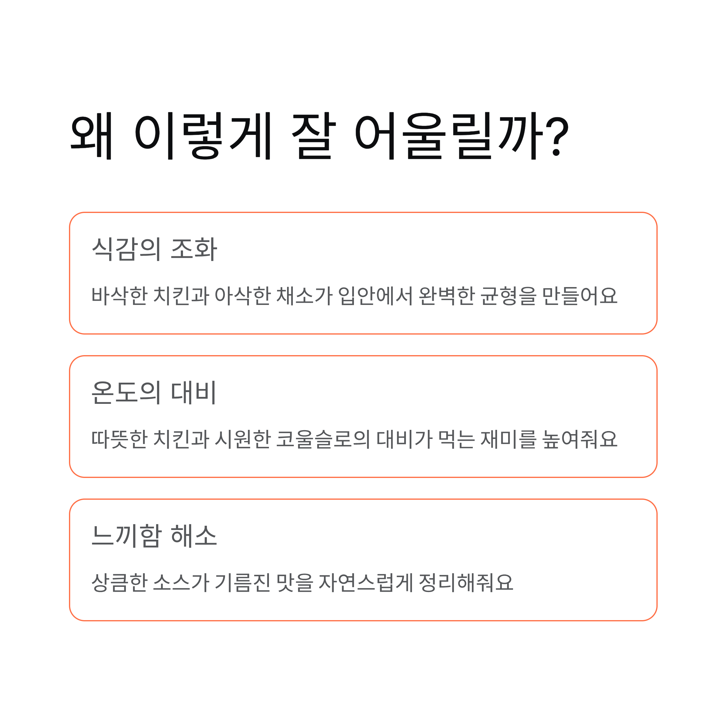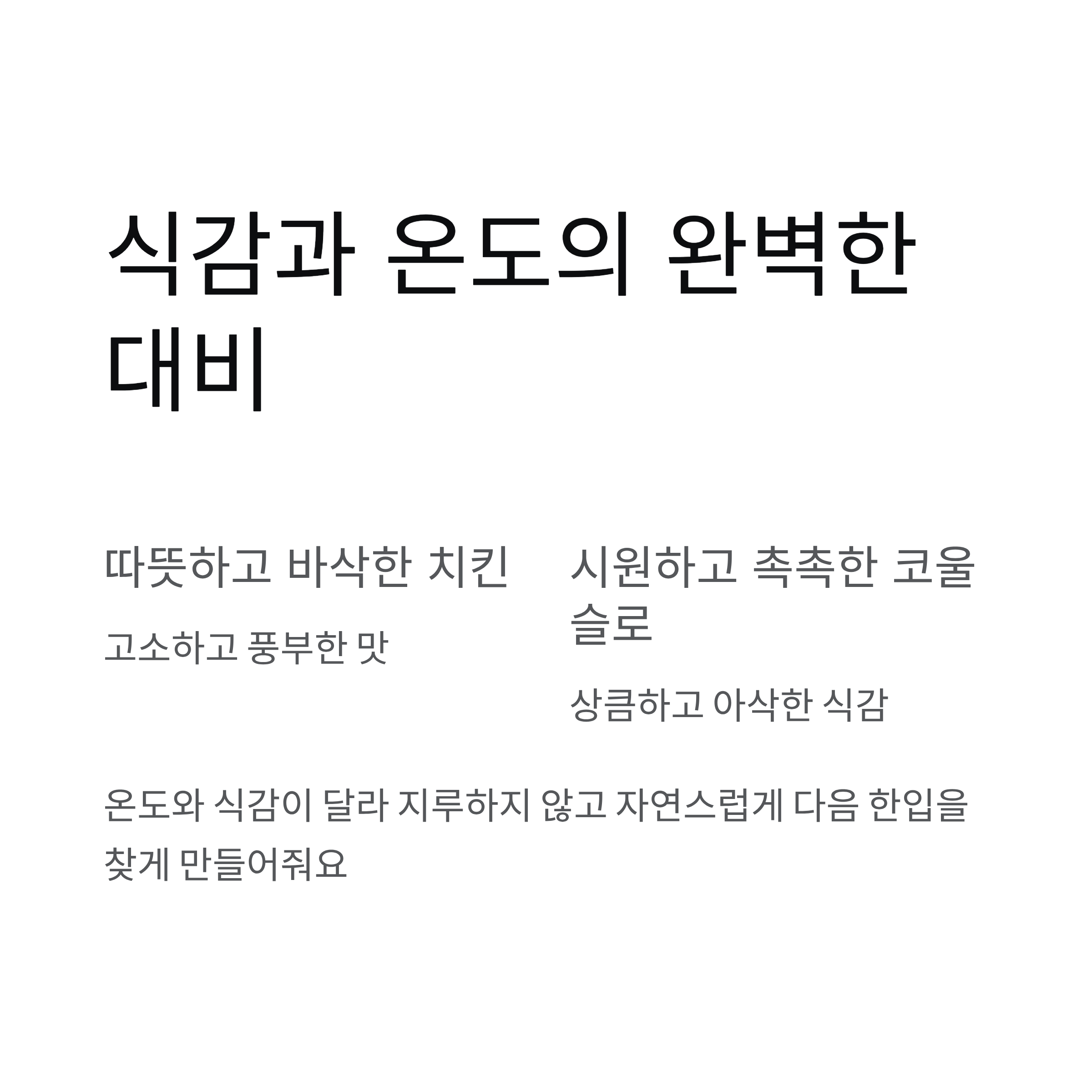 따뜻하고 바삭한 치킨과 시원하고 촉촉한 코울슬로의 대비는 음식의 재미를 높여줘요. 온도와 식감이 달라 먹을 때 지루하지 않고 자연스럽게 다음 한입을 찾게 만들어줘요. 동일한 맛이 반복되는 배달 음식에서 이런 대비는 특히 만족감을 높여주는 요소예요.