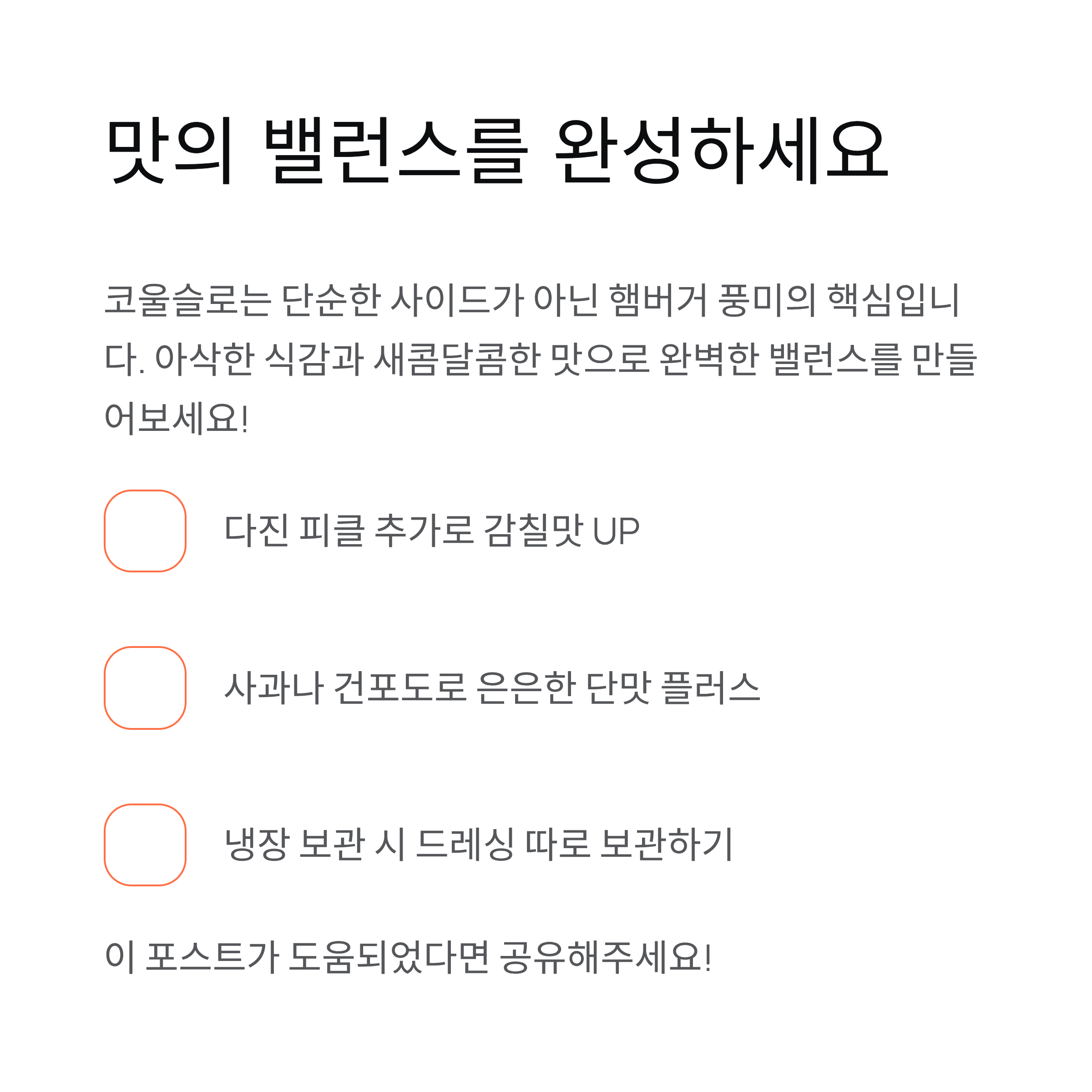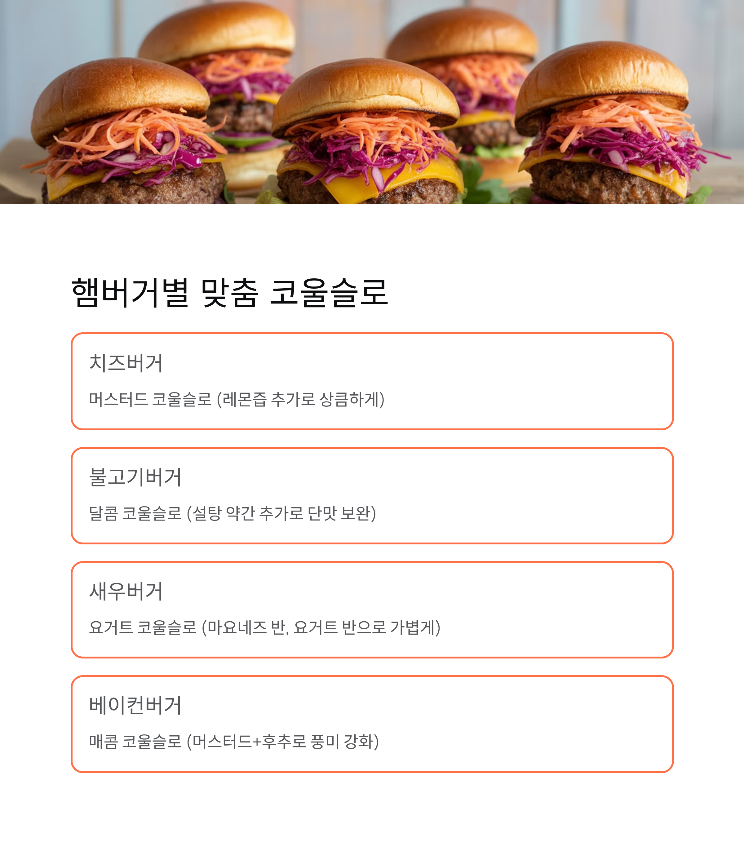 코울슬로 햄버거에 넣어 먹는 꿀조합, 아삭함과 풍미의 완벽 밸런스