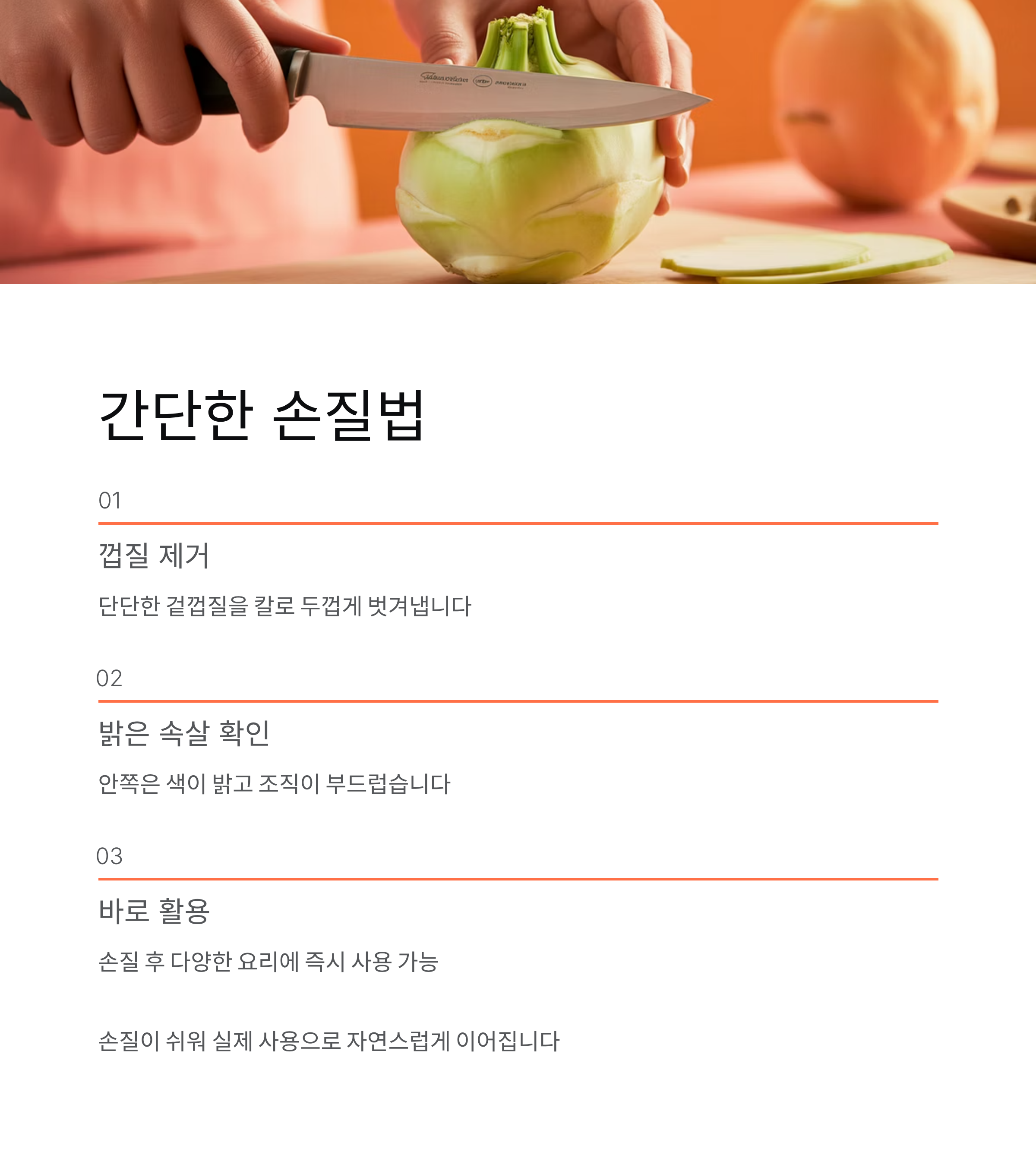 콜라비 손질은 생각보다 간단합니다. 겉껍질이 단단해 칼로 두껍게 벗겨내는 것이 좋습니다. 껍질을 제거하면 안쪽은 색이 밝고 조직이 부드러워 다양한 요리에 바로 활용할 수 있습니다. 손질이 어렵지 않다는 점은 장보기 이후 실제 사용으로 이어지는 중요한 연결 고리입니다.