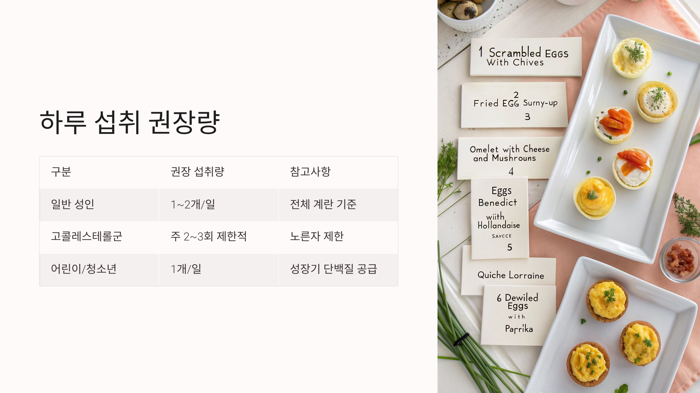 | 일반 성인 | 1~2개/일 | 전체 계란 기준 |