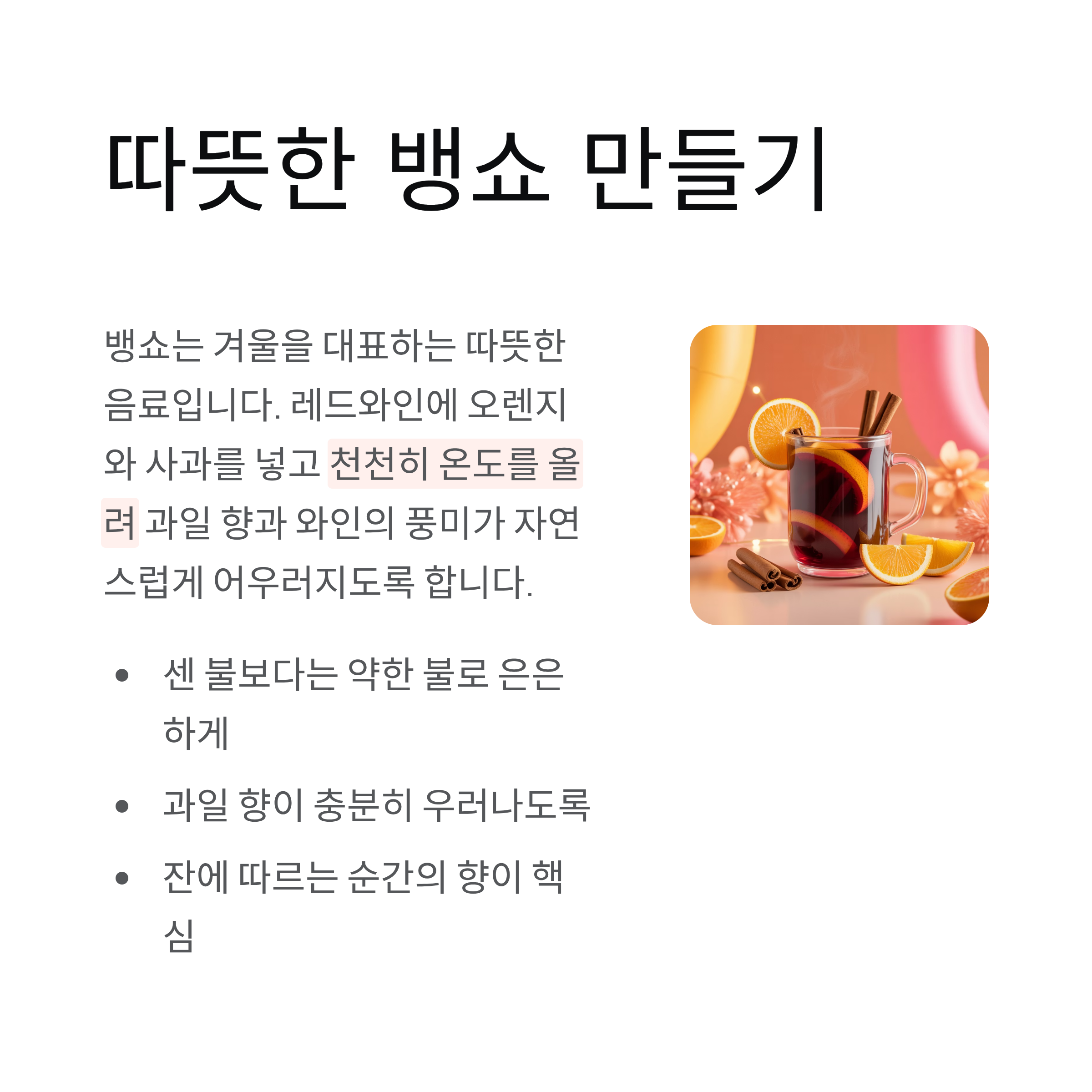 뱅쇼는 겨울을 대표하는 따뜻한 음료로, 크리스마스와 잘 어울리는 분위기를 가지고 있습니다. 레드와인에 오렌지와 사과를 넣고 은은하게 데우며 향을 우려내는 방식이 기본입니다. 센 불보다는 천천히 온도를 올려 과일 향과 와인의 풍미가 자연스럽게 어우러지도록 하는 것이 중요합니다. 잔에 따르는 순간 퍼지는 향만으로도 연말 감성이 충분히 전달됩니다.