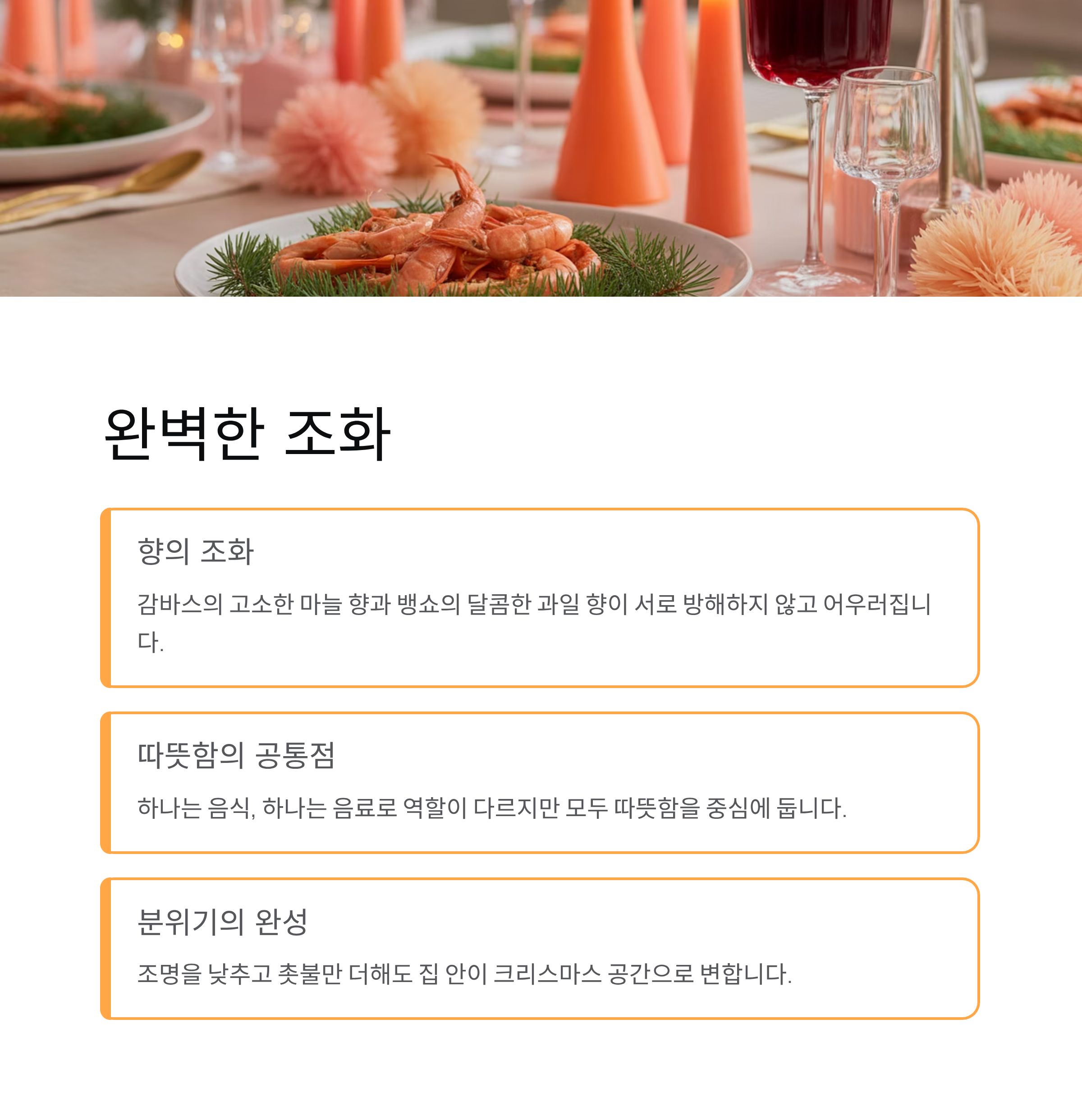 감바스의 고소한 마늘 향과 뱅쇼의 달콤하고 따뜻한 과일 향은 서로 방해하지 않고 조화를 이룹니다. 하나는 음식으로, 다른 하나는 음료로 역할이 분명하지만 공통적으로 따뜻함을 중심에 두고 있어 겨울 식탁에 안정감을 줍니다. 조명을 조금 낮추고 테이블 위에 작은 촛불만 더해도 집 안이 크리스마스 공간으로 바뀌는 느낌을 받을 수 있습니다.