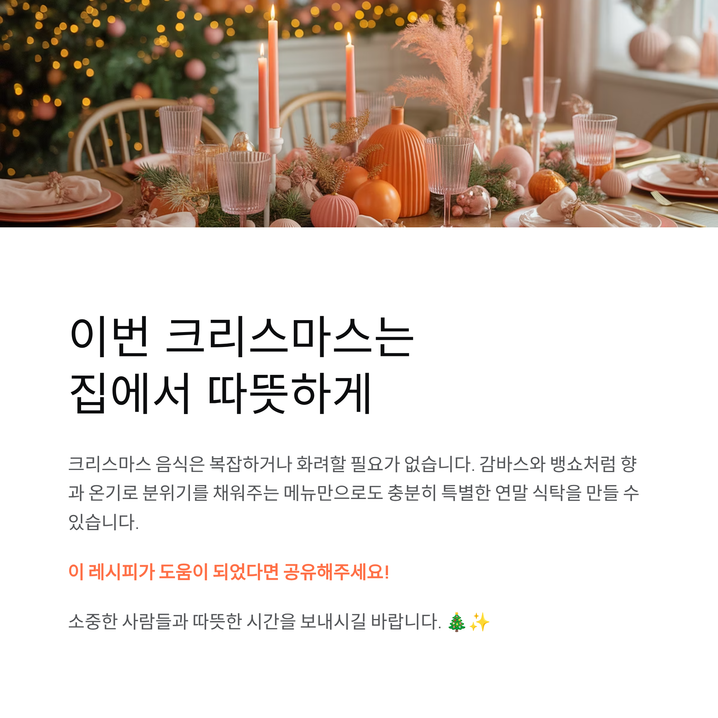 크리스마스 음식은 반드시 복잡하거나 화려할 필요는 없습니다. 감바스와 뱅쇼처럼 향과 온기로 분위기를 채워주는 메뉴만으로도 충분히 특별한 연말 식탁을 만들 수 있습니다. 이번 크리스마스에는 집에서 따뜻한 요리와 음료로 소중한 사람들과의 시간을 천천히 즐겨보시길 바랍니다.
