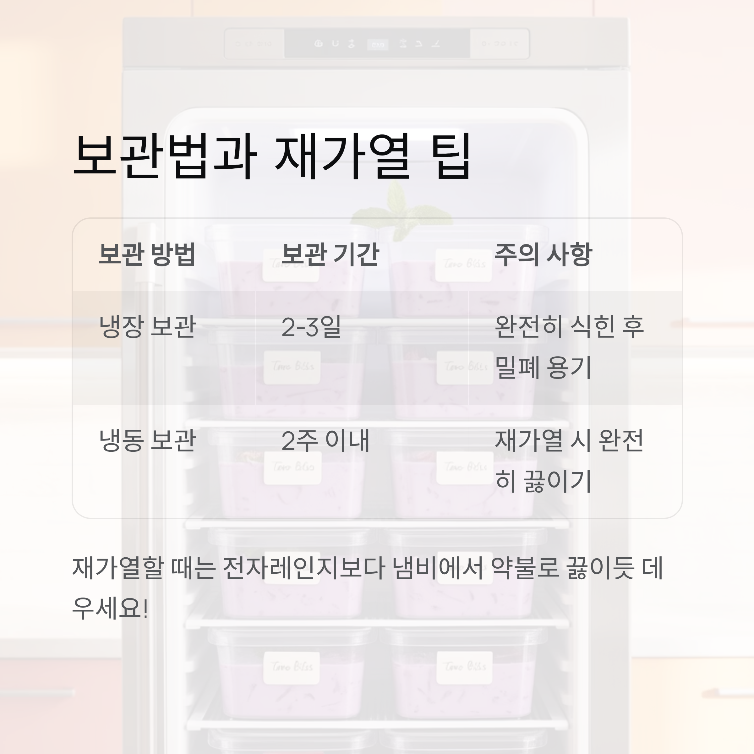 | 냉장 | 2~3일 | 식힌 후 밀폐 용기 보관 |