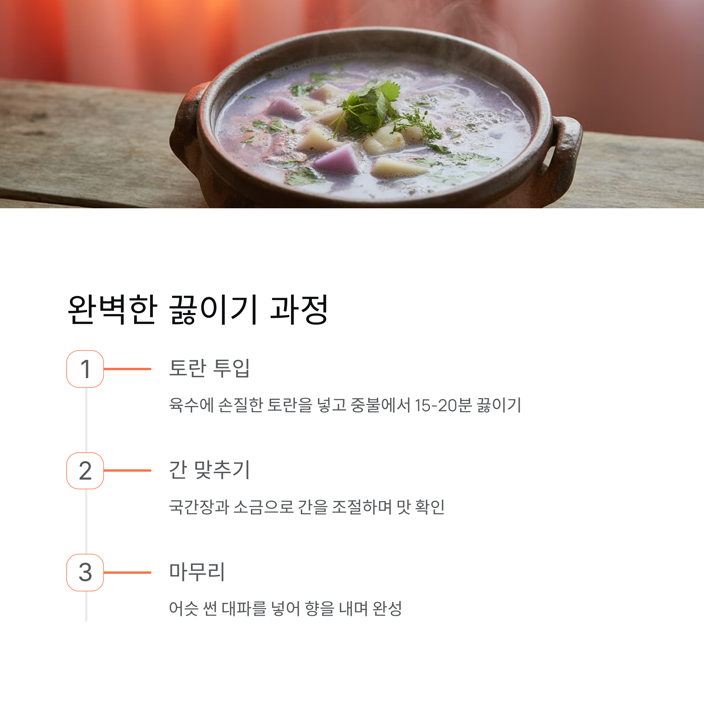 토란국은 특별한 비법이 필요하지 않습니다. 재료 본연의 맛을 살리고, 불 조절과 간만 잘 맞추면 누구나 완벽한 맛을 낼 수 있죠.