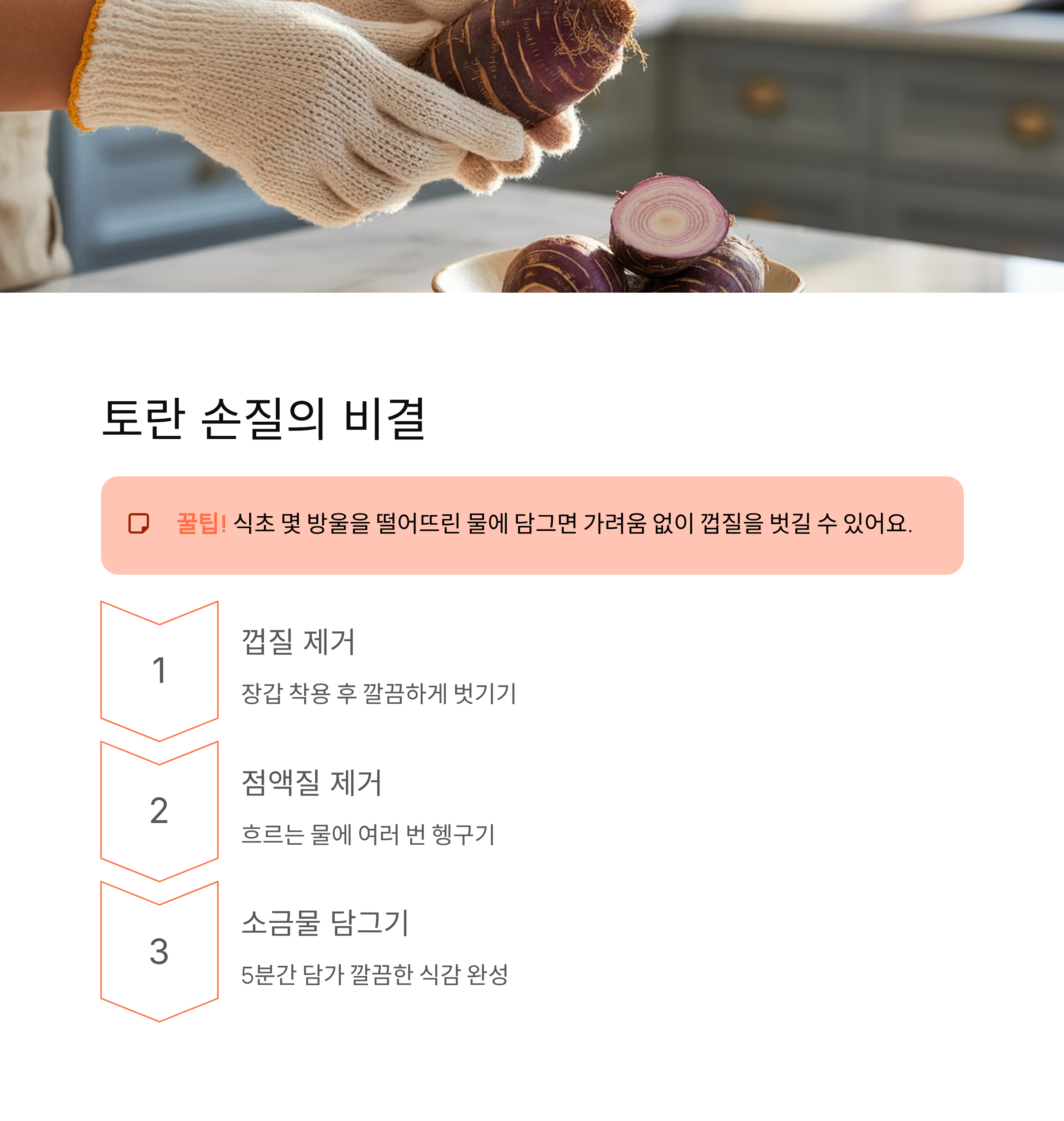 토란은 손질이 까다롭지만, 제대로 손질만 하면 그 부드럽고 담백한 맛에 반하게 됩니다. 껍질 벗길 때는 반드시 장갑을 끼거나, 살짝 데쳐서 미끄러움을 줄인 뒤 사용하세요.