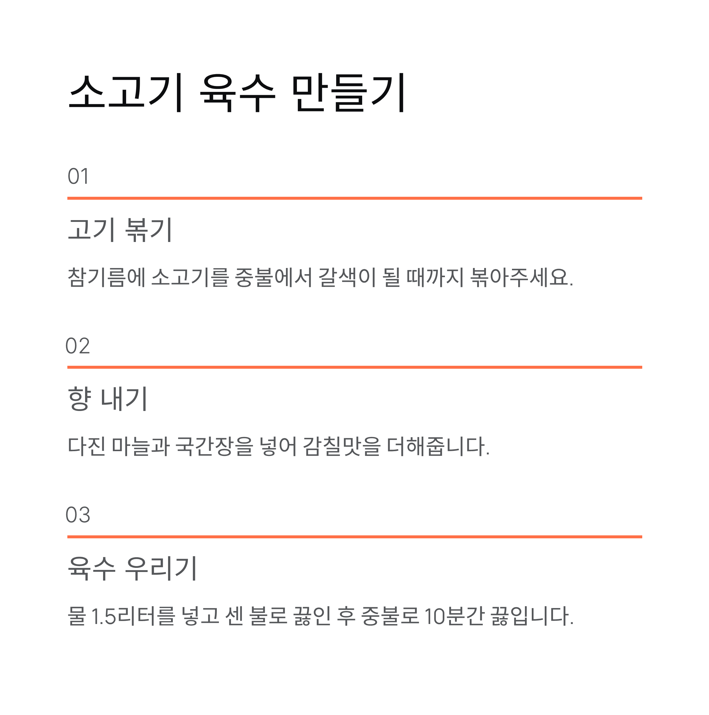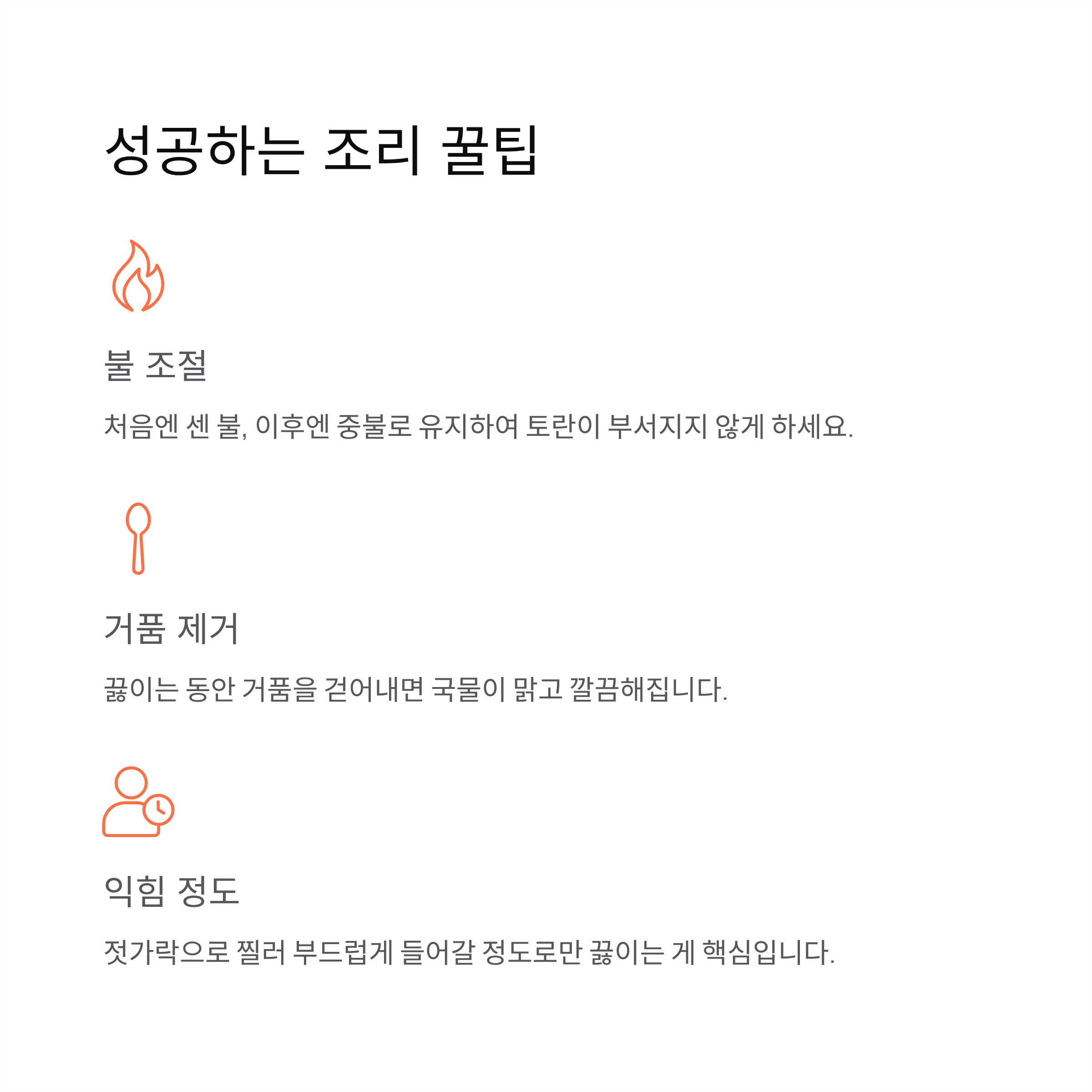 - 거품 걷기: 끓이는 동안 떠오르는 거품을 제거하면 국물이 맑고 깔끔해집니다.