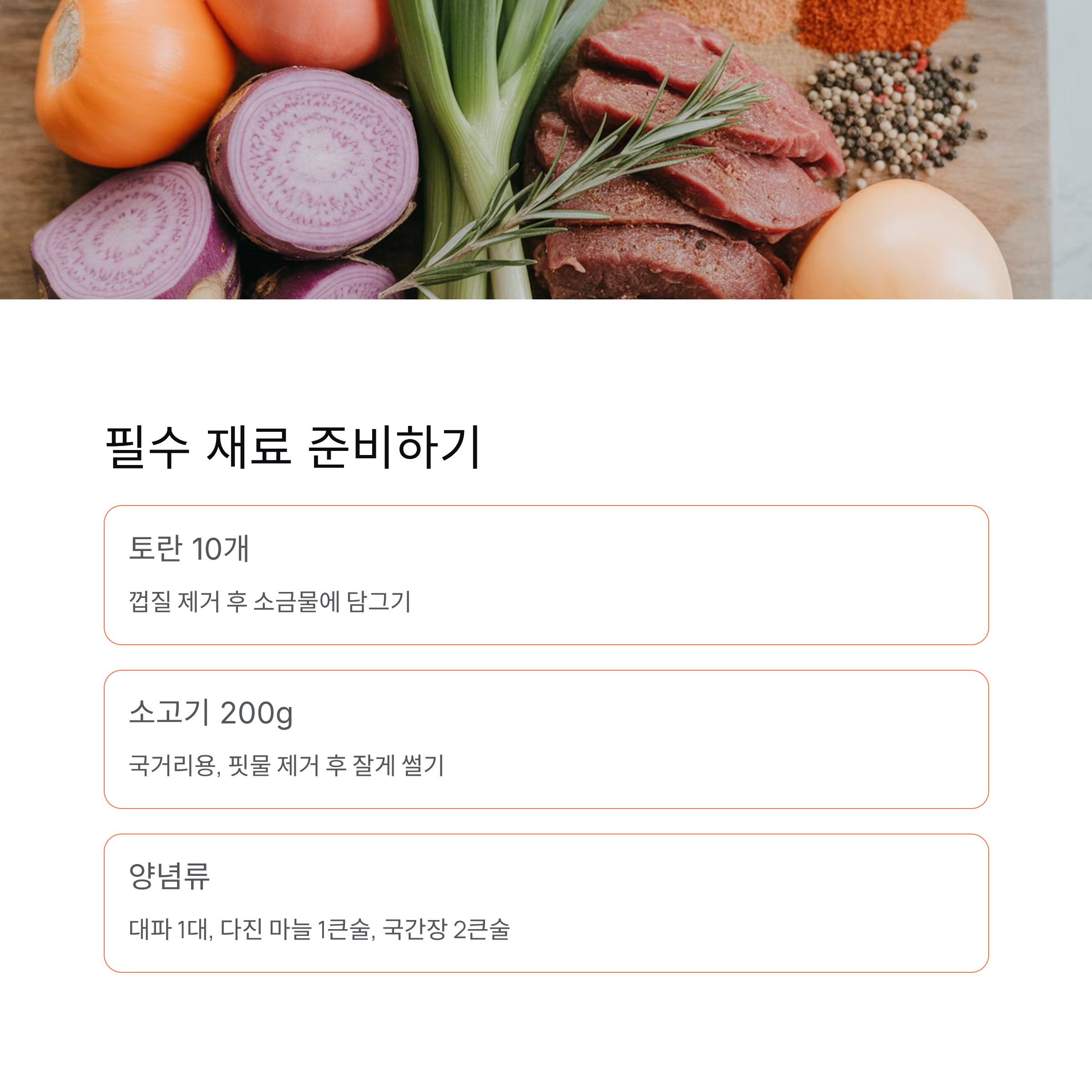토란국의 기본은 신선한 재료와 깔끔한 손질입니다. 토란은 껍질이 매끄럽고 단단한 것을 고르고, 고명용으로 소고기나 멸치 육수를 사용하면 더욱 진한 맛이 납니다.