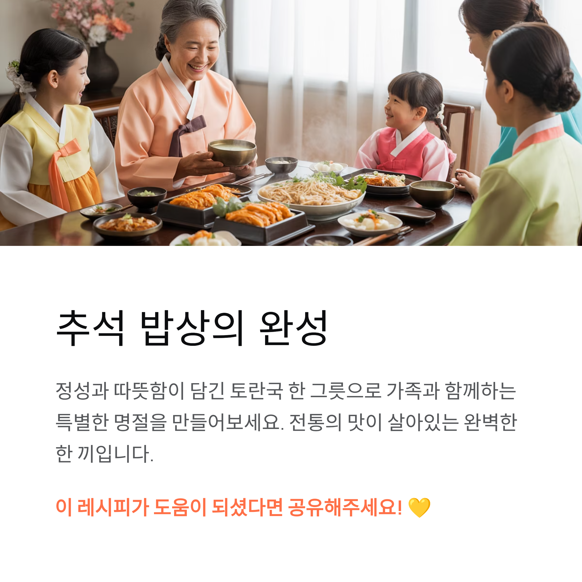 토란국은 단순한 국이 아닙니다. 명절의 정서, 가족의 따뜻함, 그리고 가을의 풍성함이 함께 담긴 음식이죠.