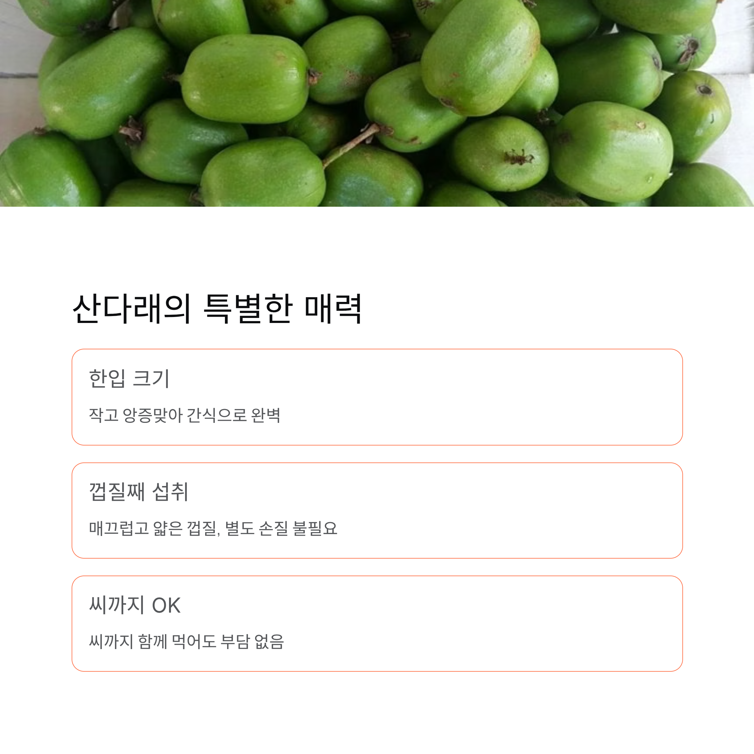 크기는 작지만 껍질째 먹을 수 있어 간편하고, 달콤하면서도 부드러운 맛이 특징입니다.