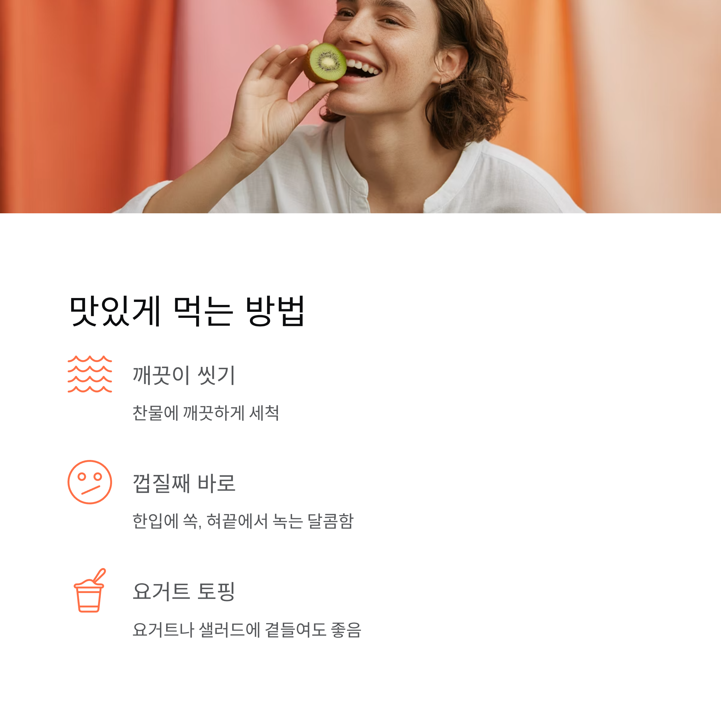 껍질이 매끄럽고 얇아 별도의 손질이 필요 없고, 씨까지 함께 먹을 수 있어 편리합니다.