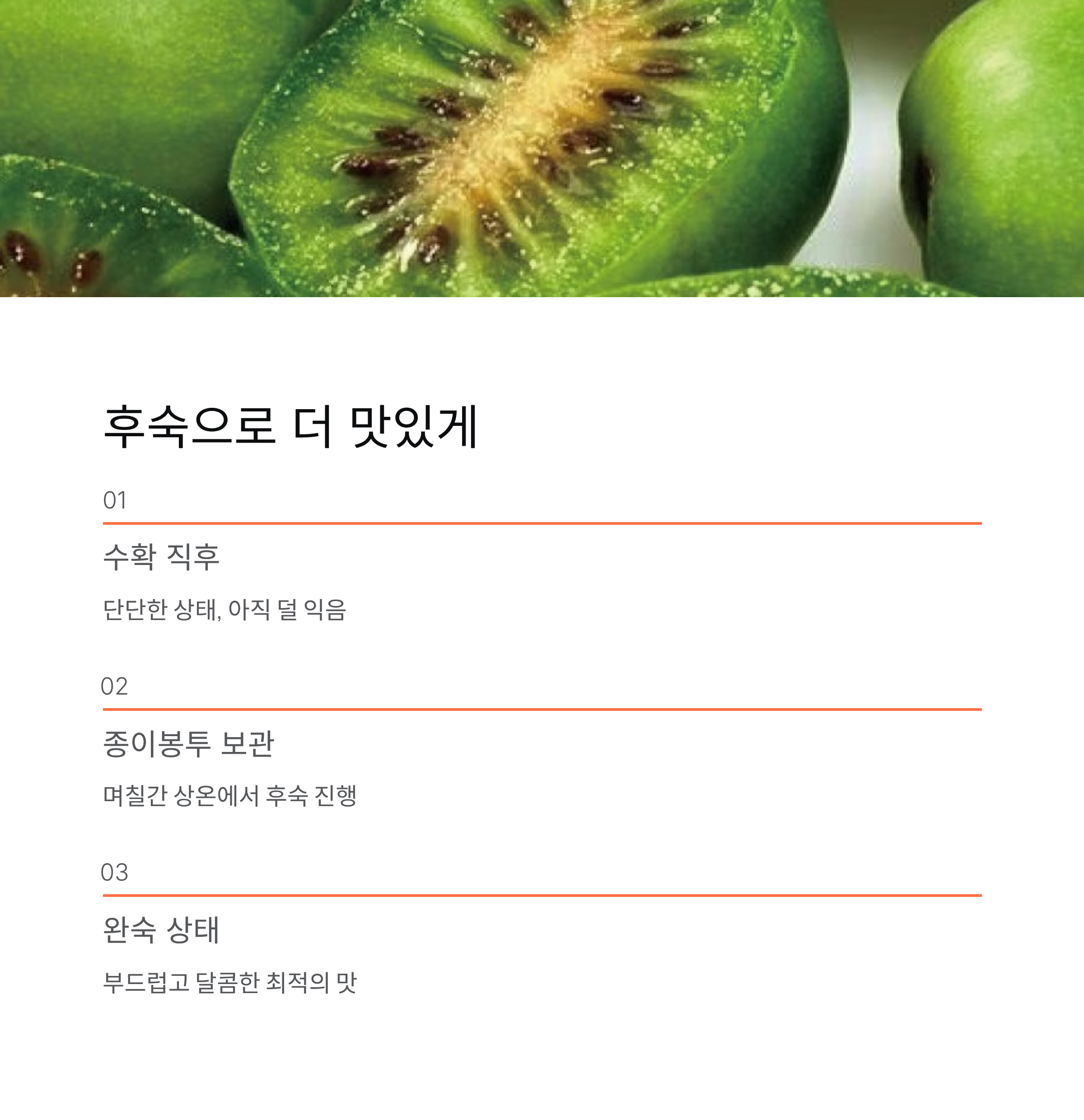 종이봉투에 담아 며칠간 두면 후숙이 진행되면서 과육이 부드럽고 달콤하게 변합니다.