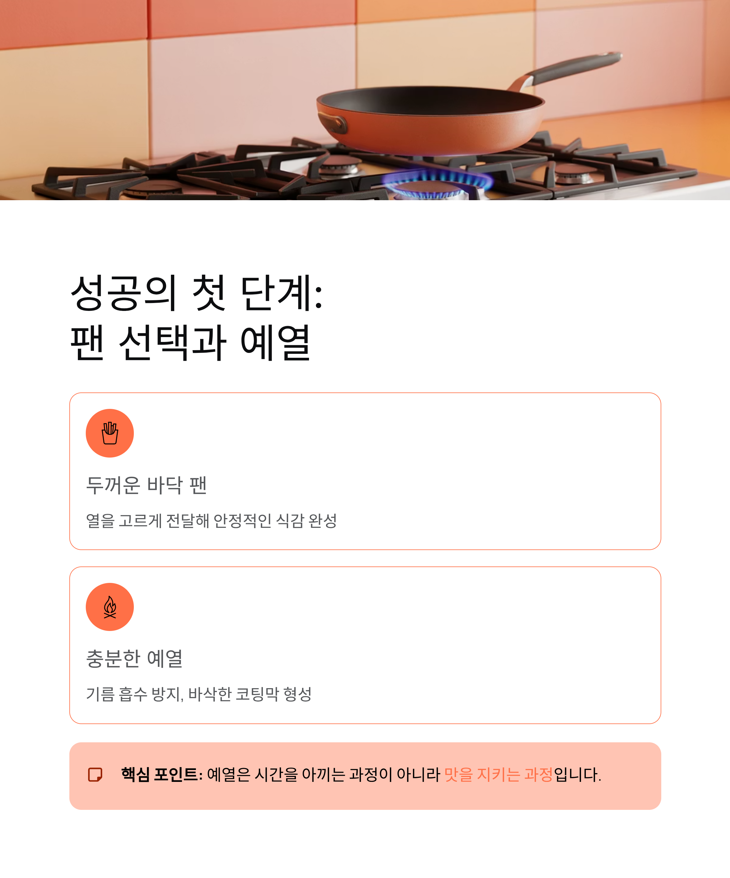 팬을 올려두고 바로 기름과 만두를 넣는 경우가 많지만, 이 과정이 군만두 실패의 가장 흔한 이유입니다. 팬이 충분히 달궈지지 않으면 만두피는 기름을 흡수하며 익게 되고, 바삭함 대신 무거운 식감이 남습니다. 반대로 예열된 팬에 기름을 두르면 기름이 얇게 퍼지며 코팅막을 만들고, 만두피는 빠르게 표면이 굳어 바삭한 구조를 형성합니다. 예열은 시간을 아끼는 과정이 아니라 맛을 지키는 과정입니다.
