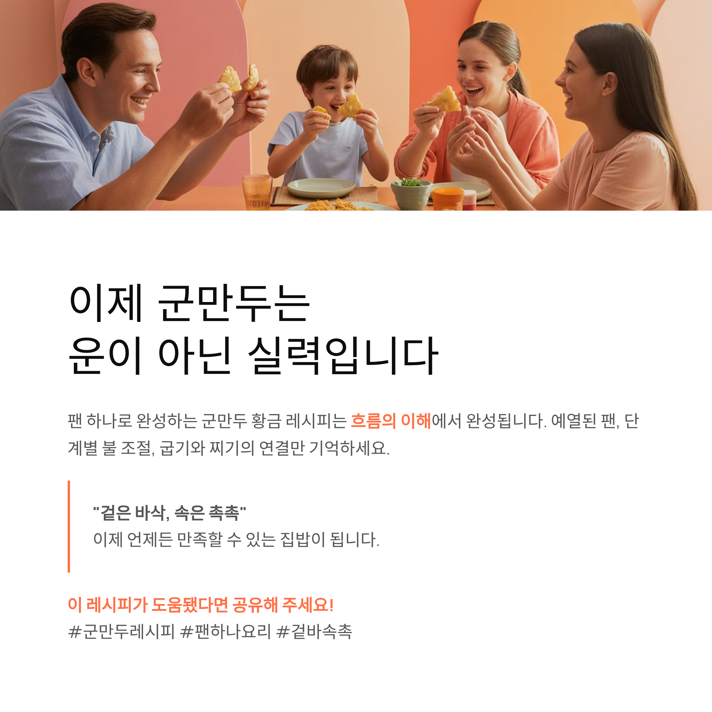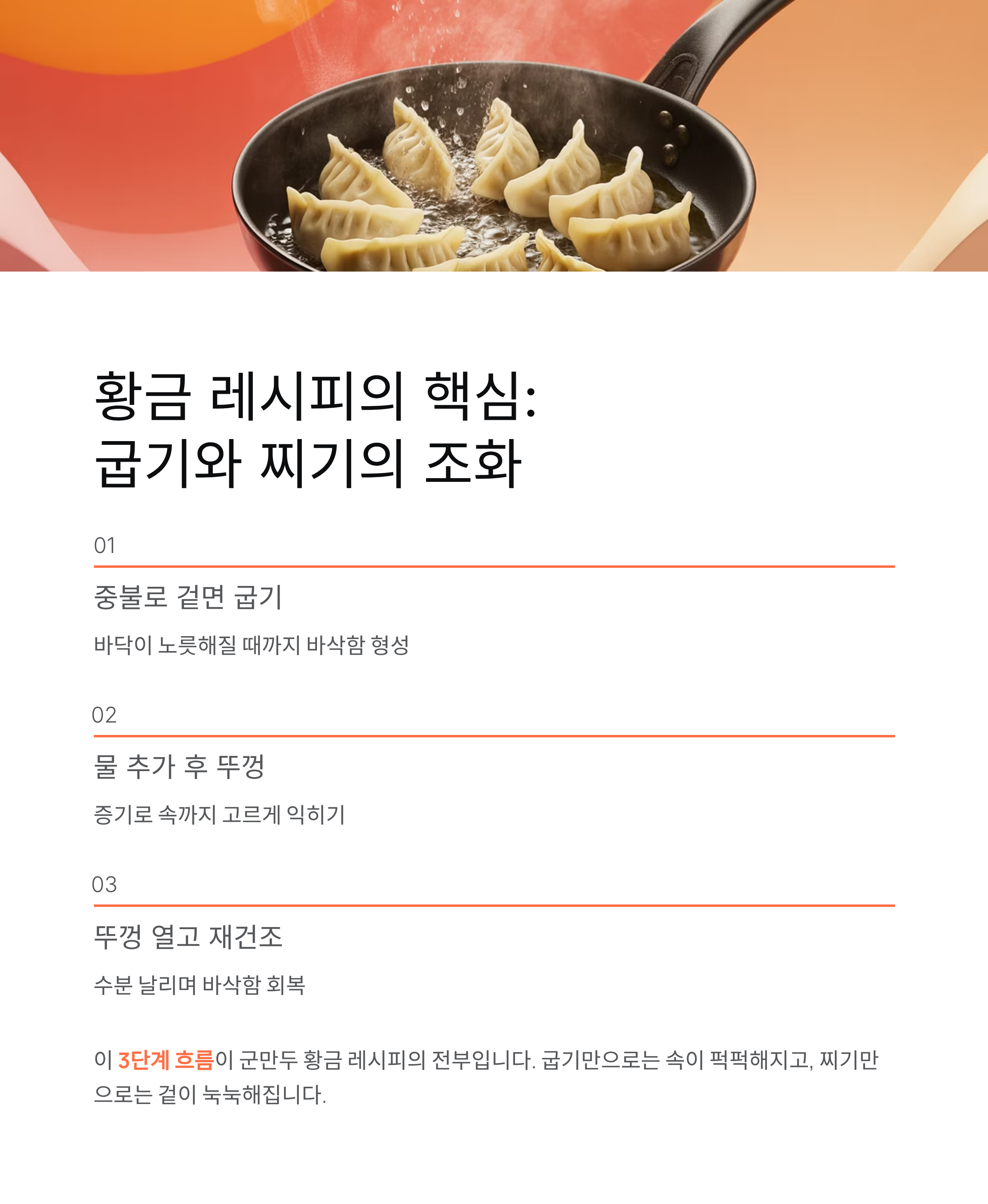 팬 하나로 완성하는 군만두 황금 레시피는 특별한 비법이 아니라 흐름의 이해에서 완성됩니다. 예열된 팬, 단계별 불 조절, 굽기와 찌기의 연결이라는 세 가지 요소가 자연스럽게 이어질 때 군만두는 속은 촉촉하고 겉은 바삭한 상태로 완성됩니다. 이 인과관계를 이해하고 적용한다면, 군만두는 더 이상 운에 맡기는 메뉴가 아니라 언제든 만족할 수 있는 집밥이 됩니다.