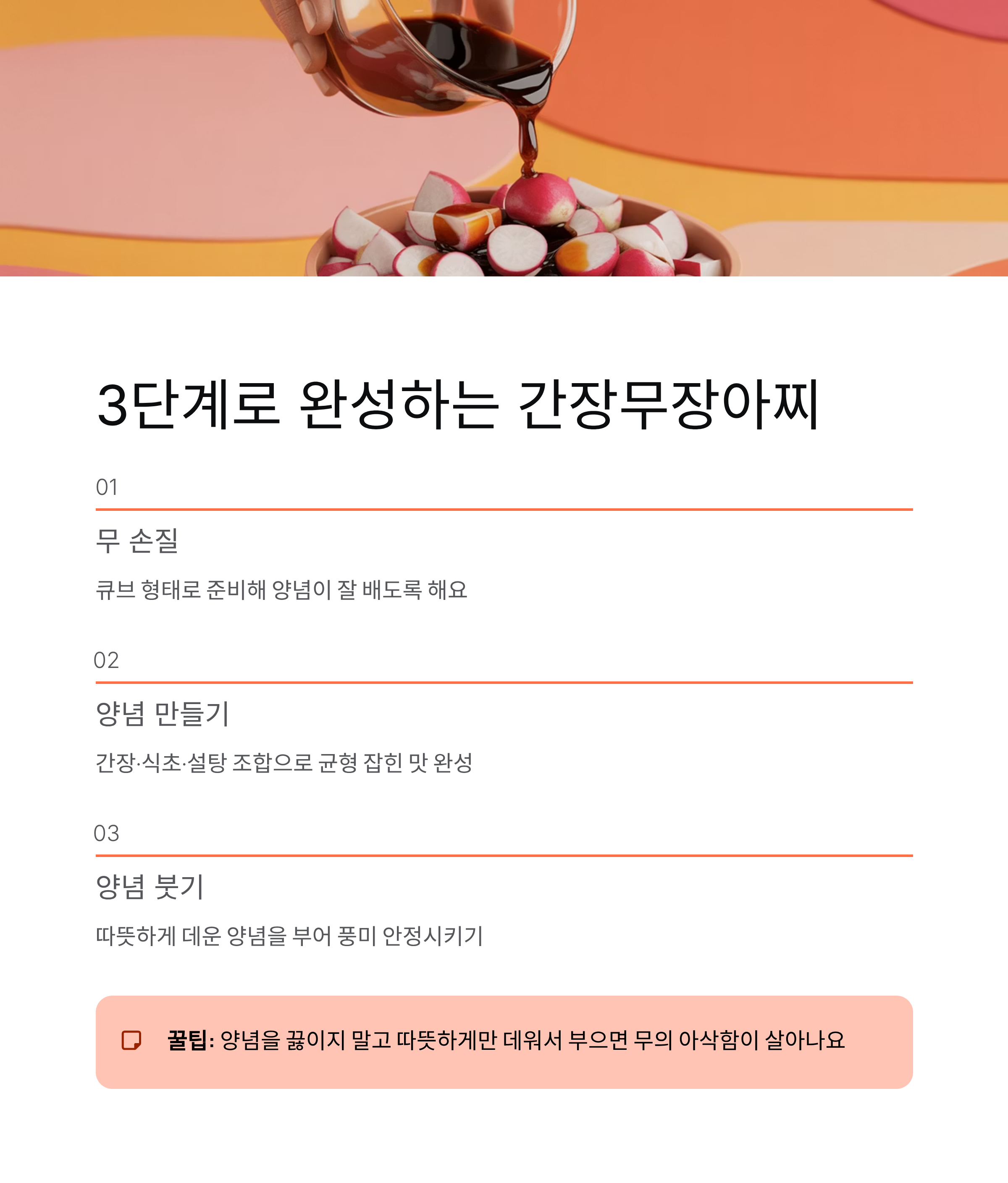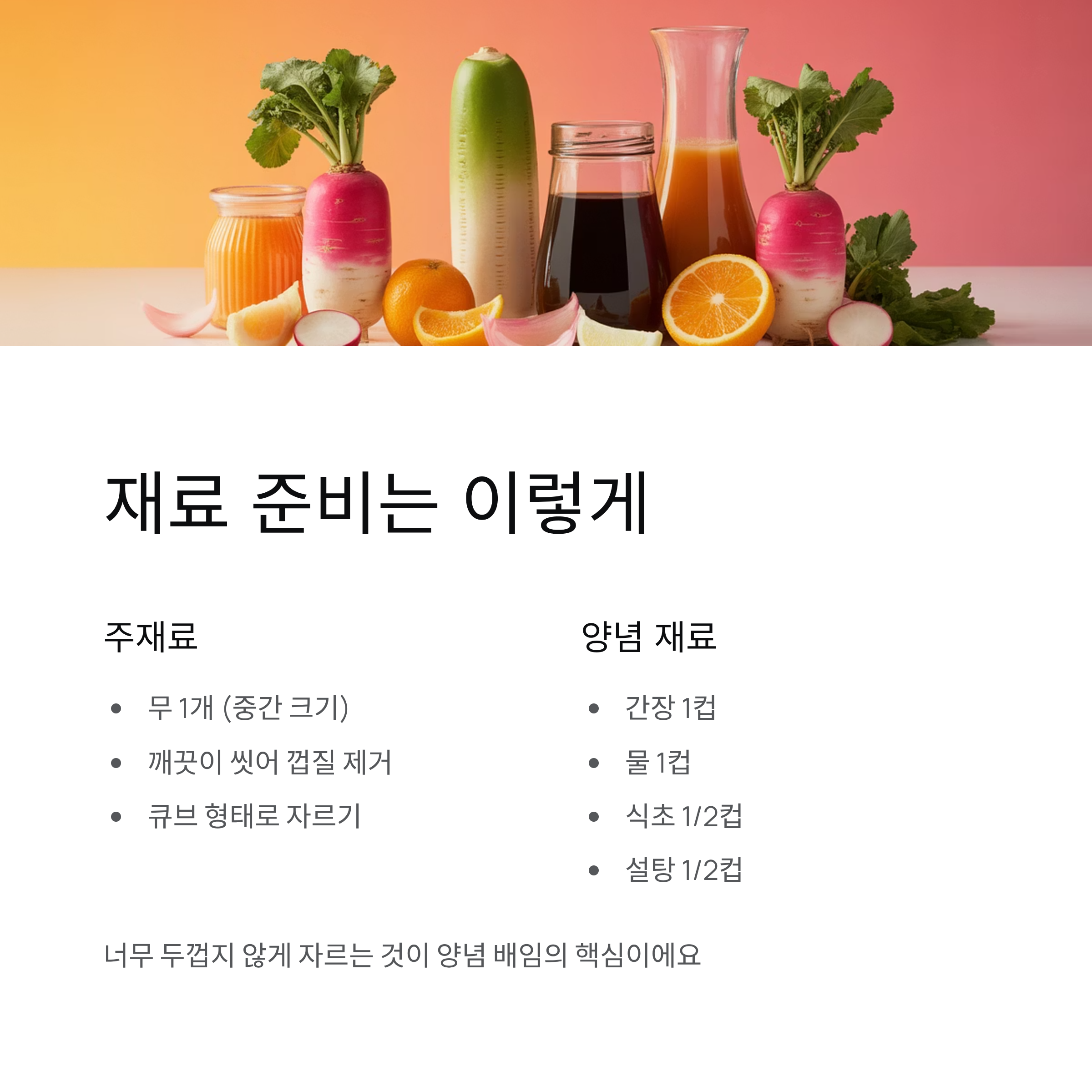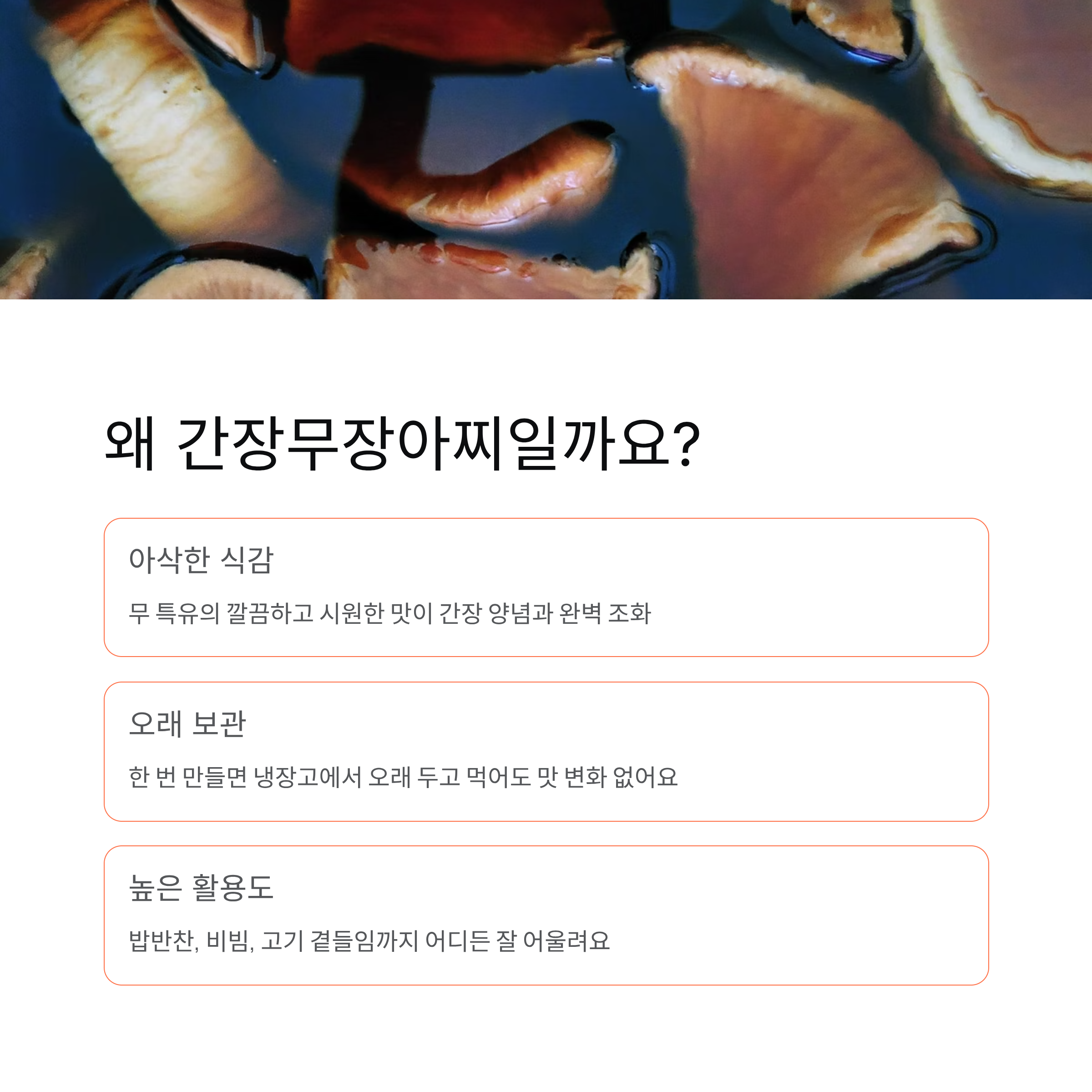 무는 기본적으로 아삭하고 깔끔한 맛이 있어 간장 양념과 잘 어울려요. 장아찌로 만들면 식감이 더 살아나고, 오래 두고 먹어도 맛이 크게 변하지 않아 반찬으로 활용도가 높아요. 한 번 만들어두면 다양한 식탁에 자연스럽게 어울립니다.