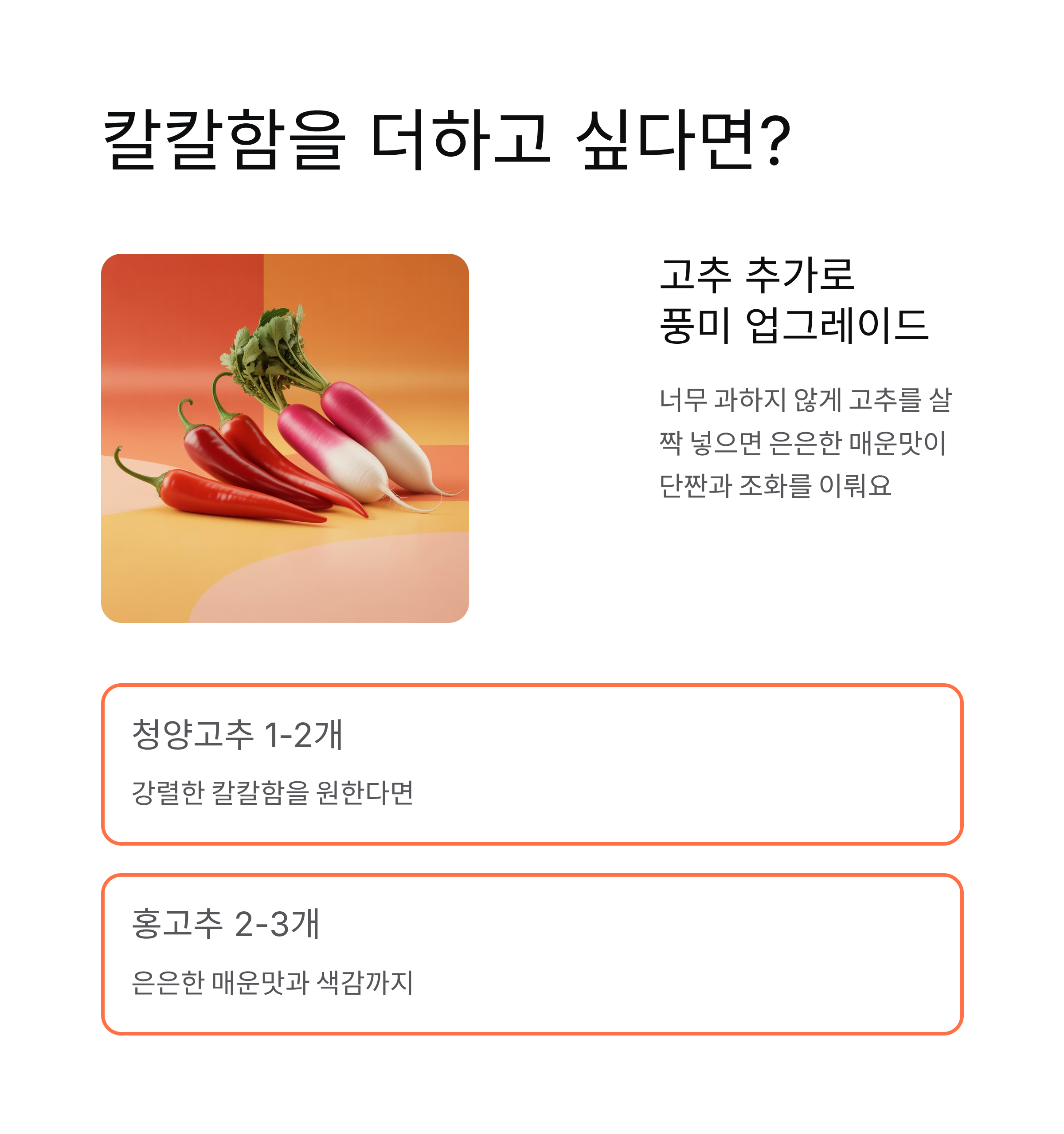 A. 고추를 약간 추가하면 은은한 매운맛이 더해져 풍미가 좋아집니다.