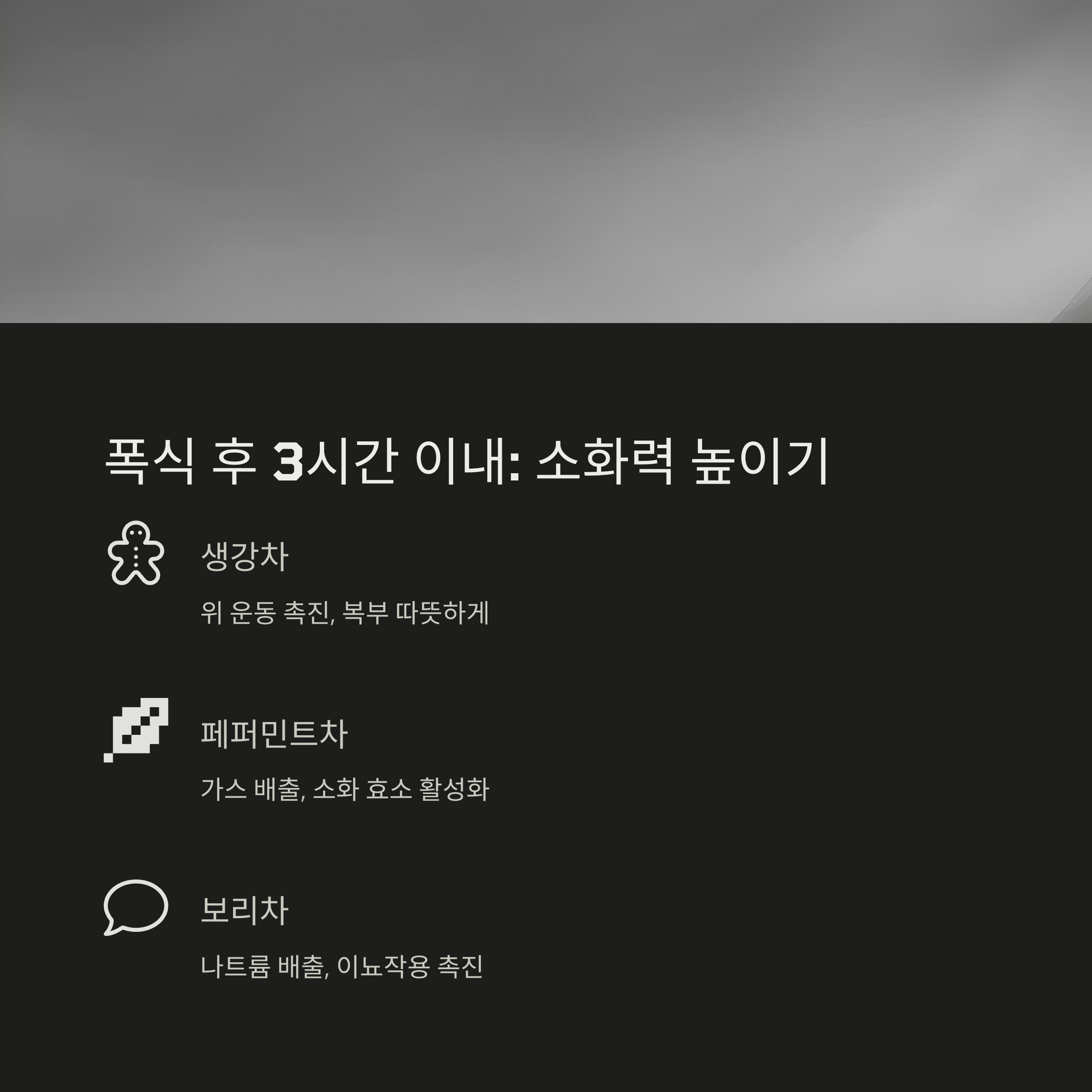 | 페퍼민트차 | 가스 배출, 소화 효소 활성화 |