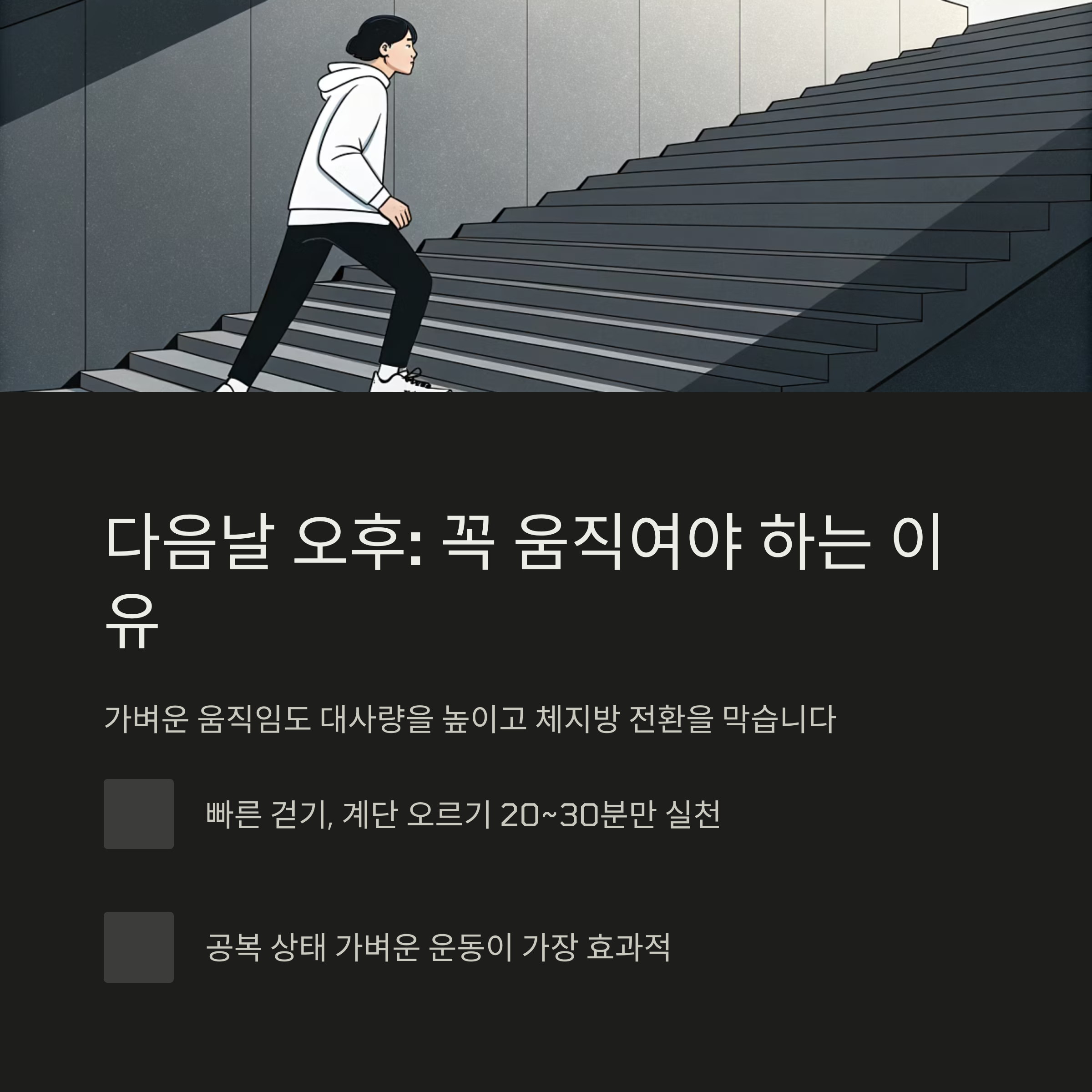 이때 움직이지 않으면 체지방 전환이 가속화됩니다.