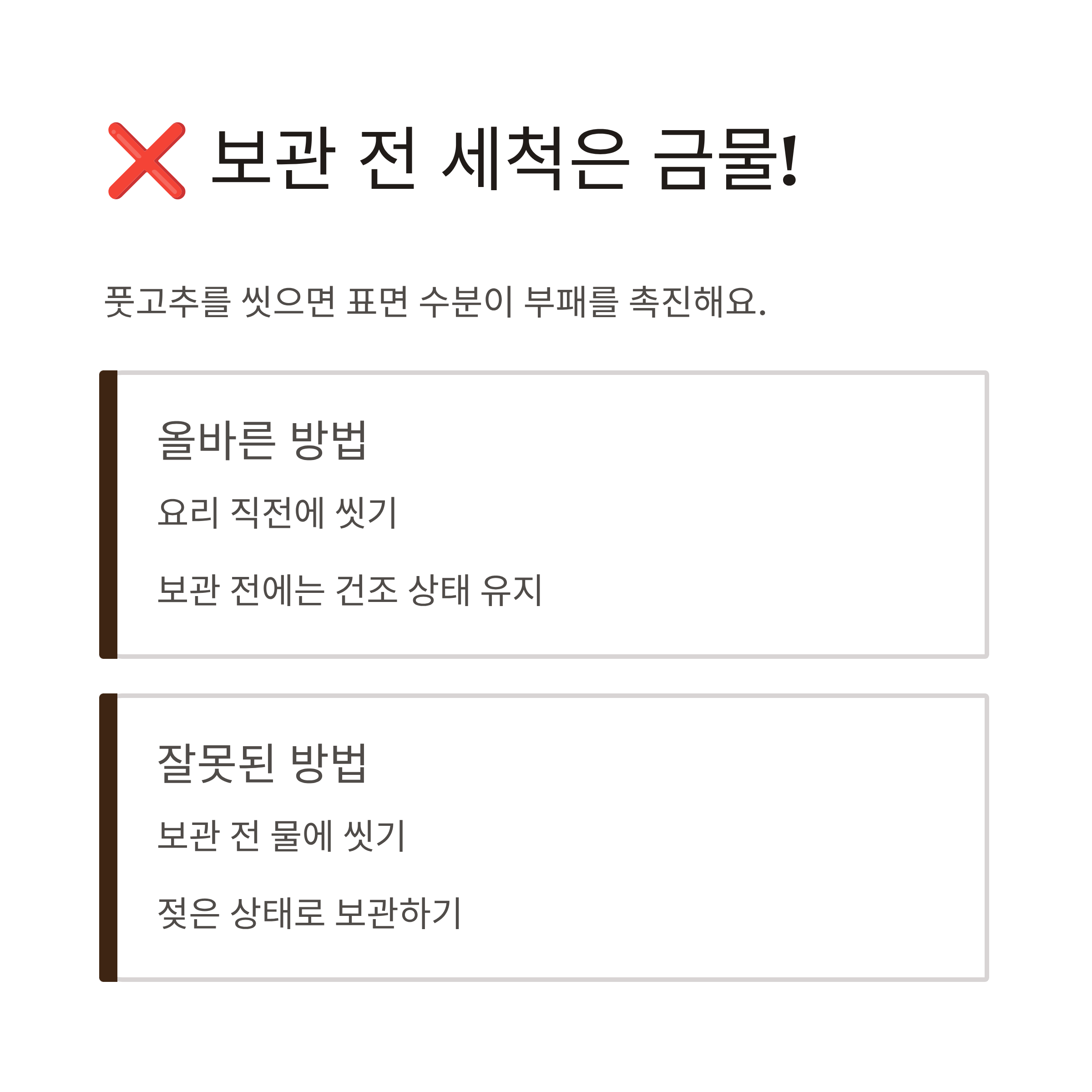 풋고추를 보관 전 씻으면 표면에 남은 물기가 부패를 촉진합니다.