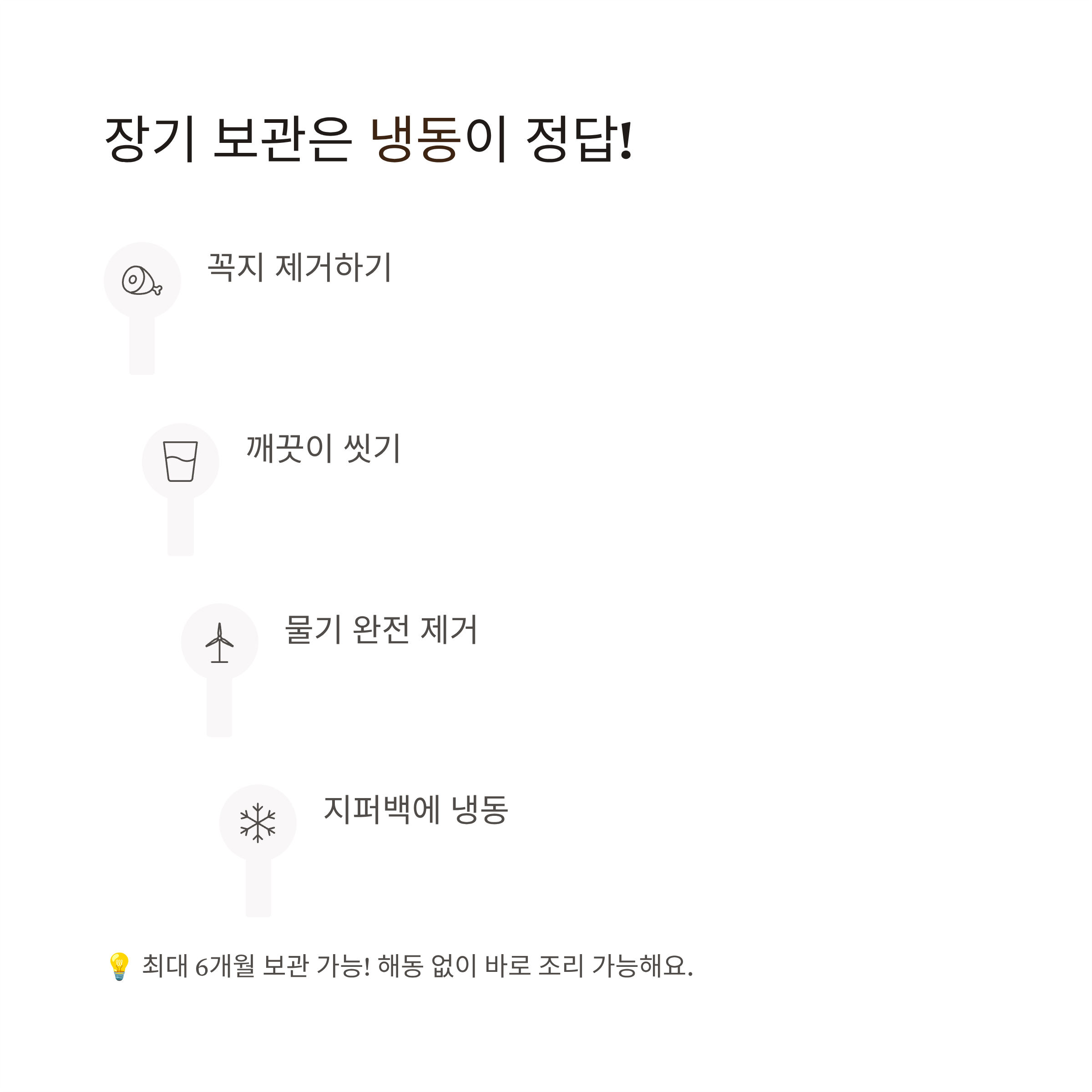 꼭지를 제거하고 깨끗이 씻어 물기를 완전히 없앤 후 지퍼백에 넣어 냉동합니다.