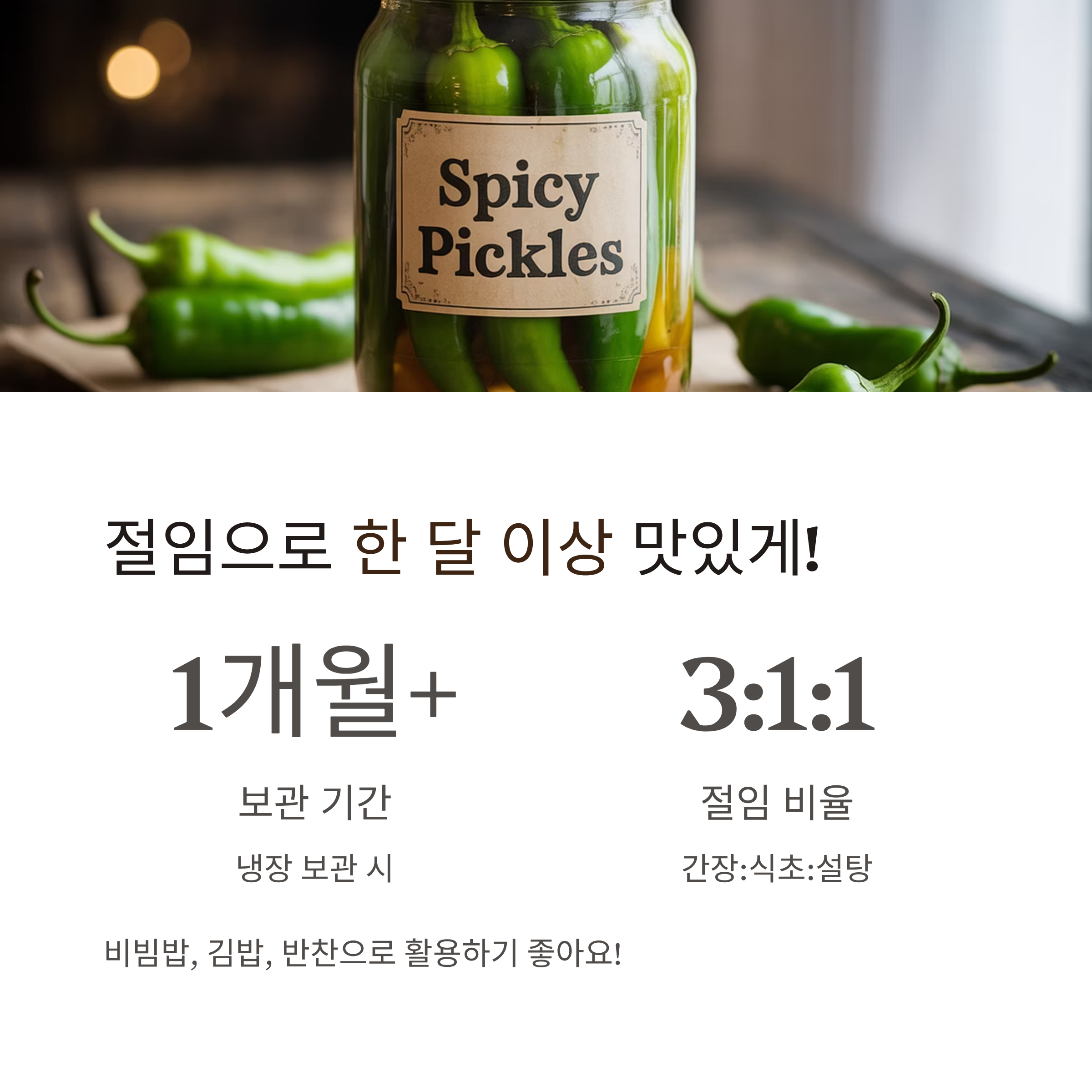 간장, 식초, 설탕 비율의 절임장에 풋고추를 담으면 한 달 이상 보관 가능합니다.