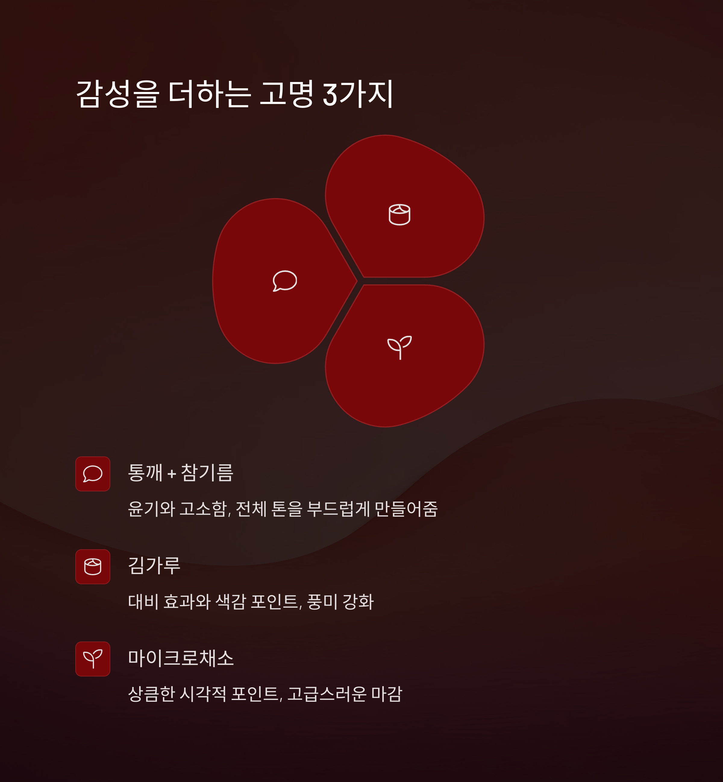 | 통깨 + 참기름 | 윤기와 고소함, 전체 톤을 부드럽게 만들어줌 |