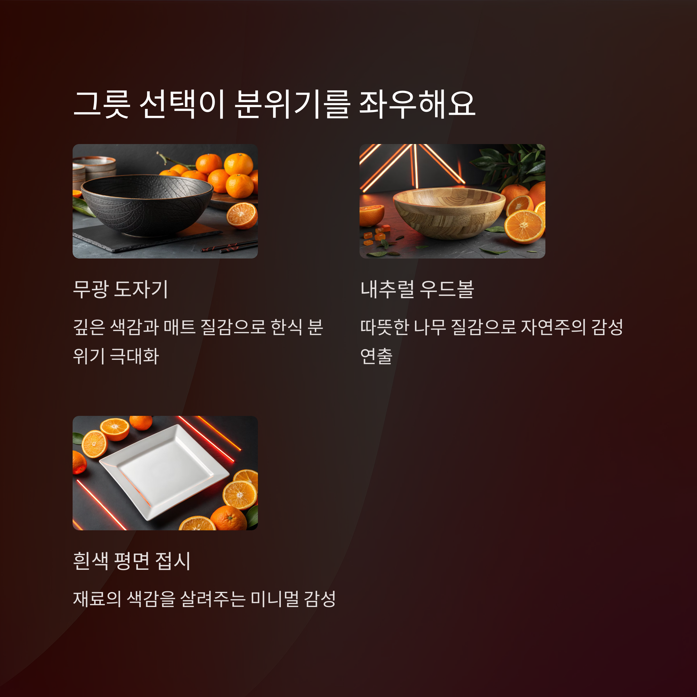 | 무광 도자기 | 깊은 색감과 매트 질감 | 한식 분위기 극대화 |