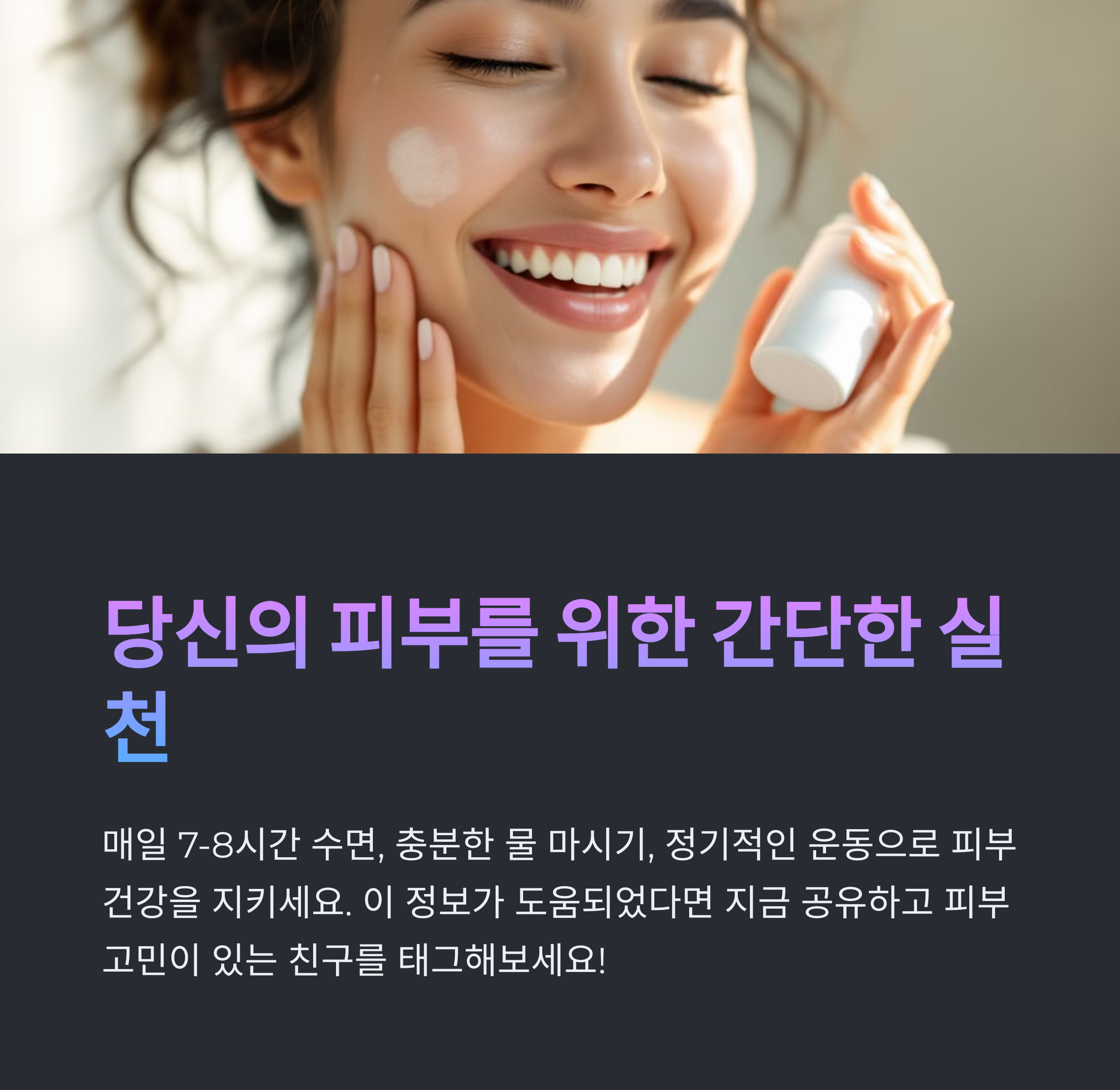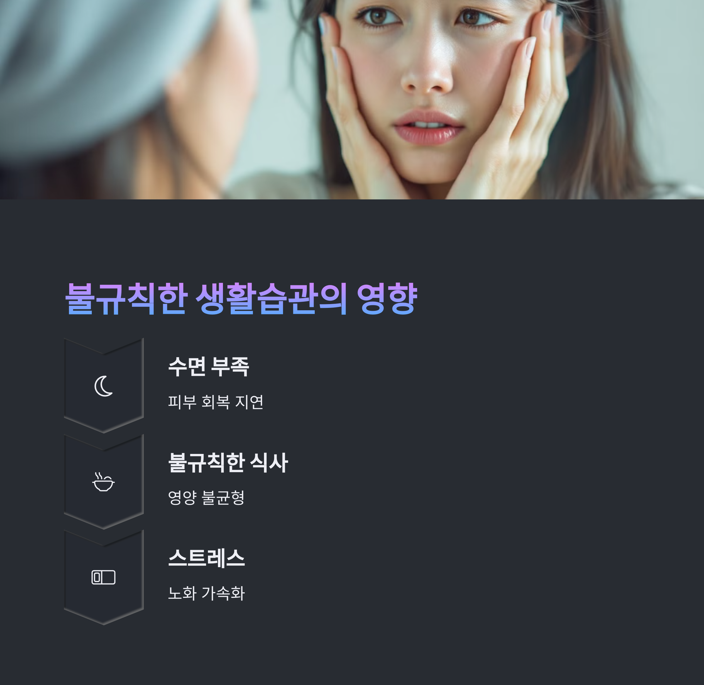 피부 노화 원인 | 자외선, 수면 부족, 잘못된 식습관이 주된 원인입니다. |