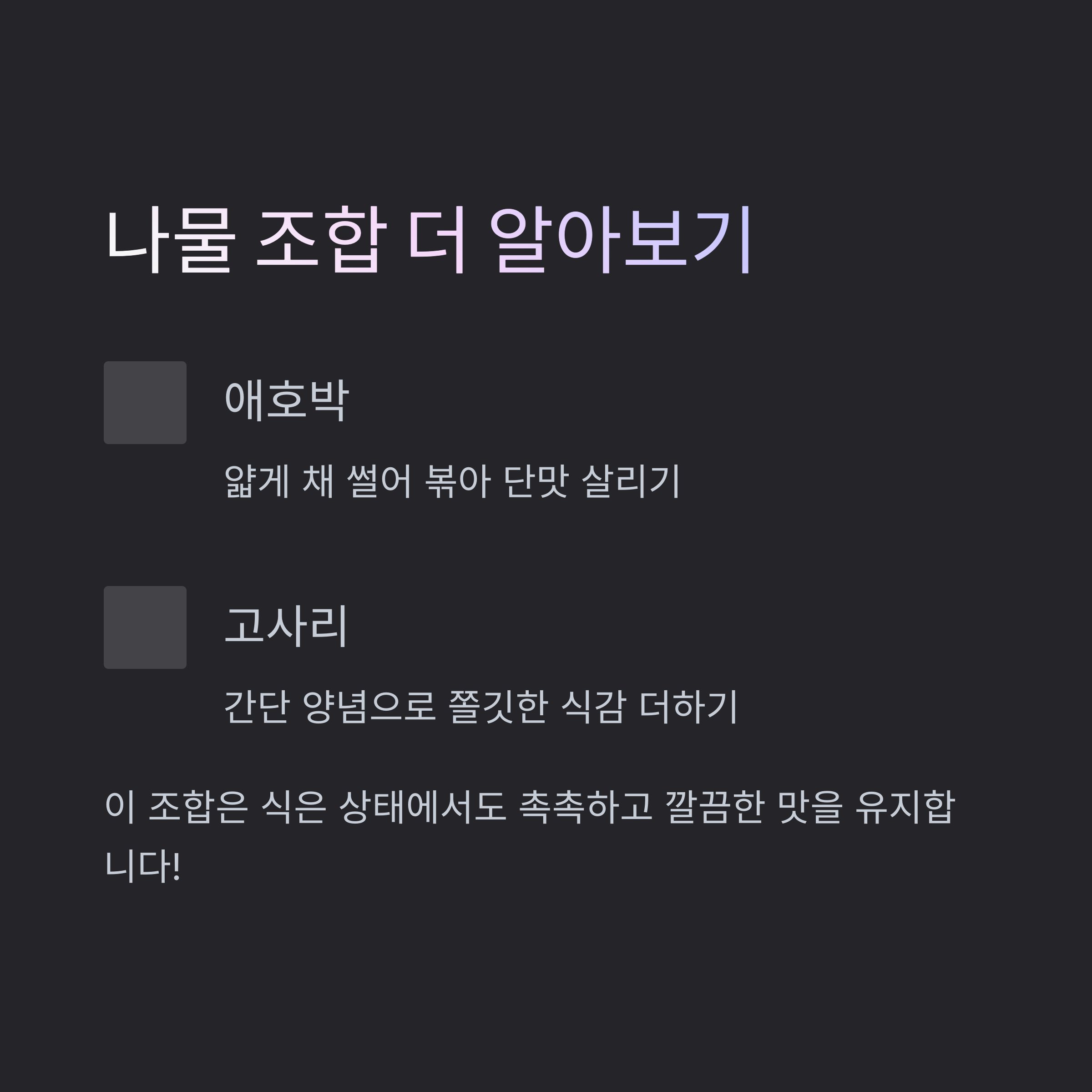 | 애호박 | 얇게 채 썰어 볶기 | 단맛으로 맛 균형 |