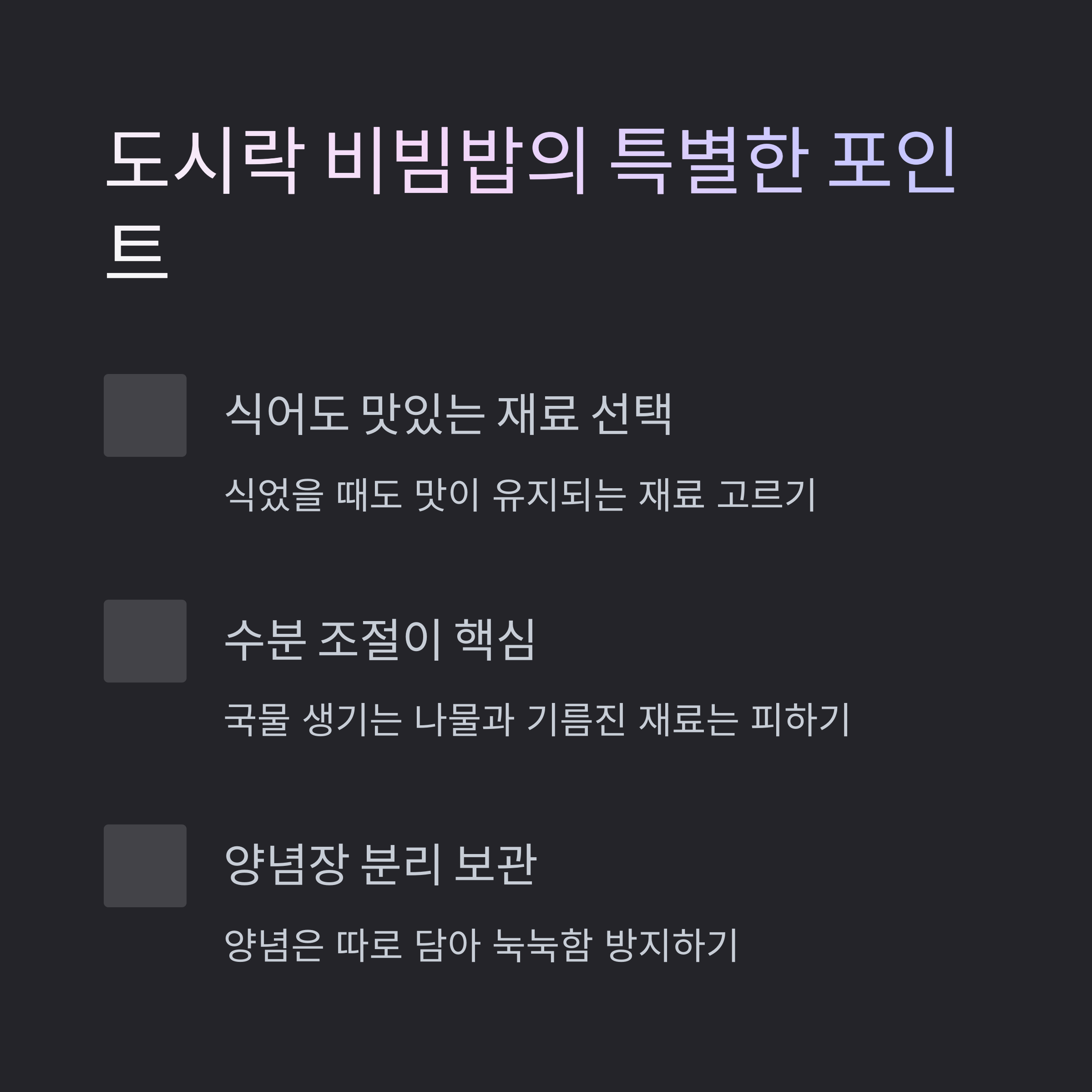 비빔장이나 고추장은 도시락 안에서 따로 분리해 담아야