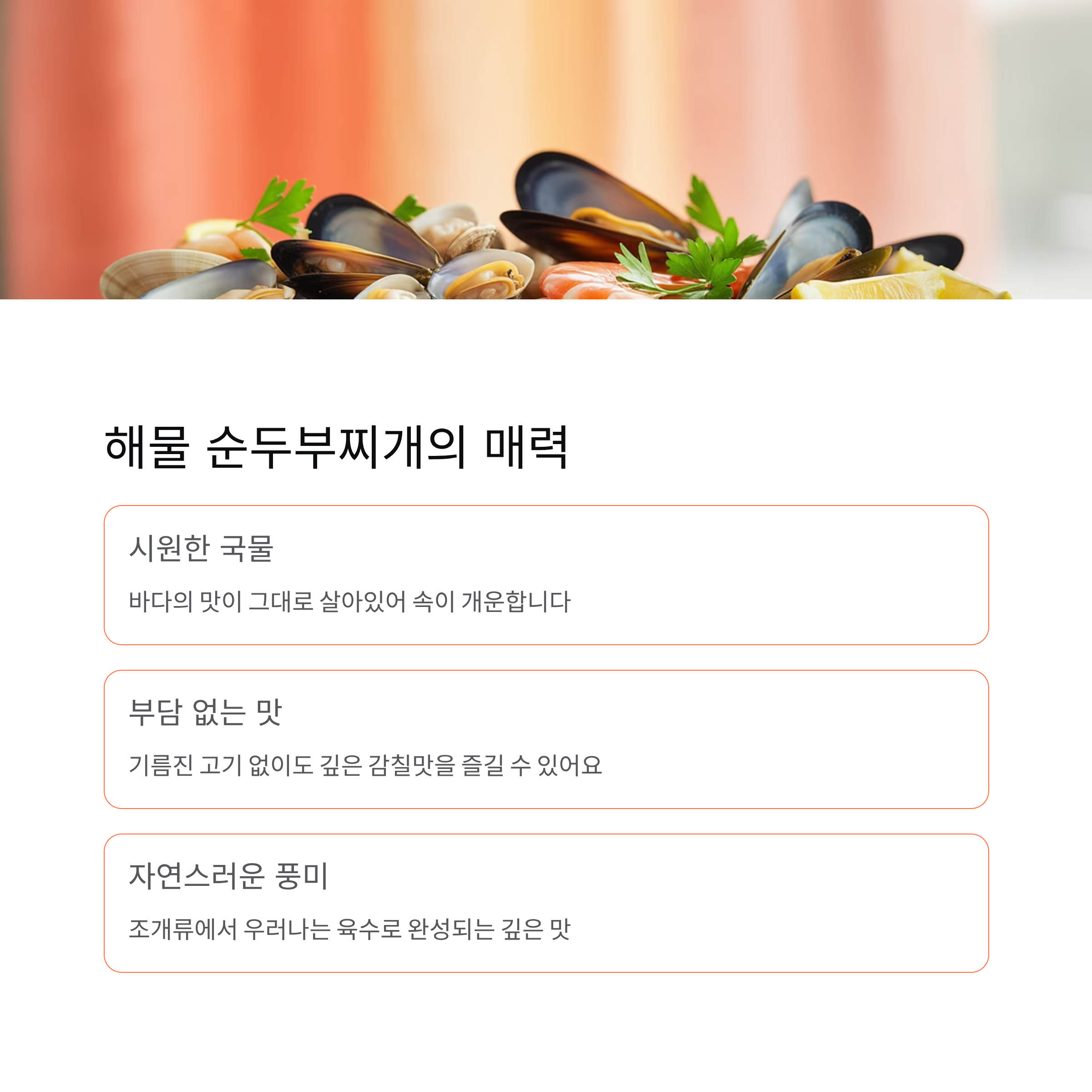 순두부의 부드러운 식감과 해물의 쫄깃한 맛은 서로를 보완합니다.