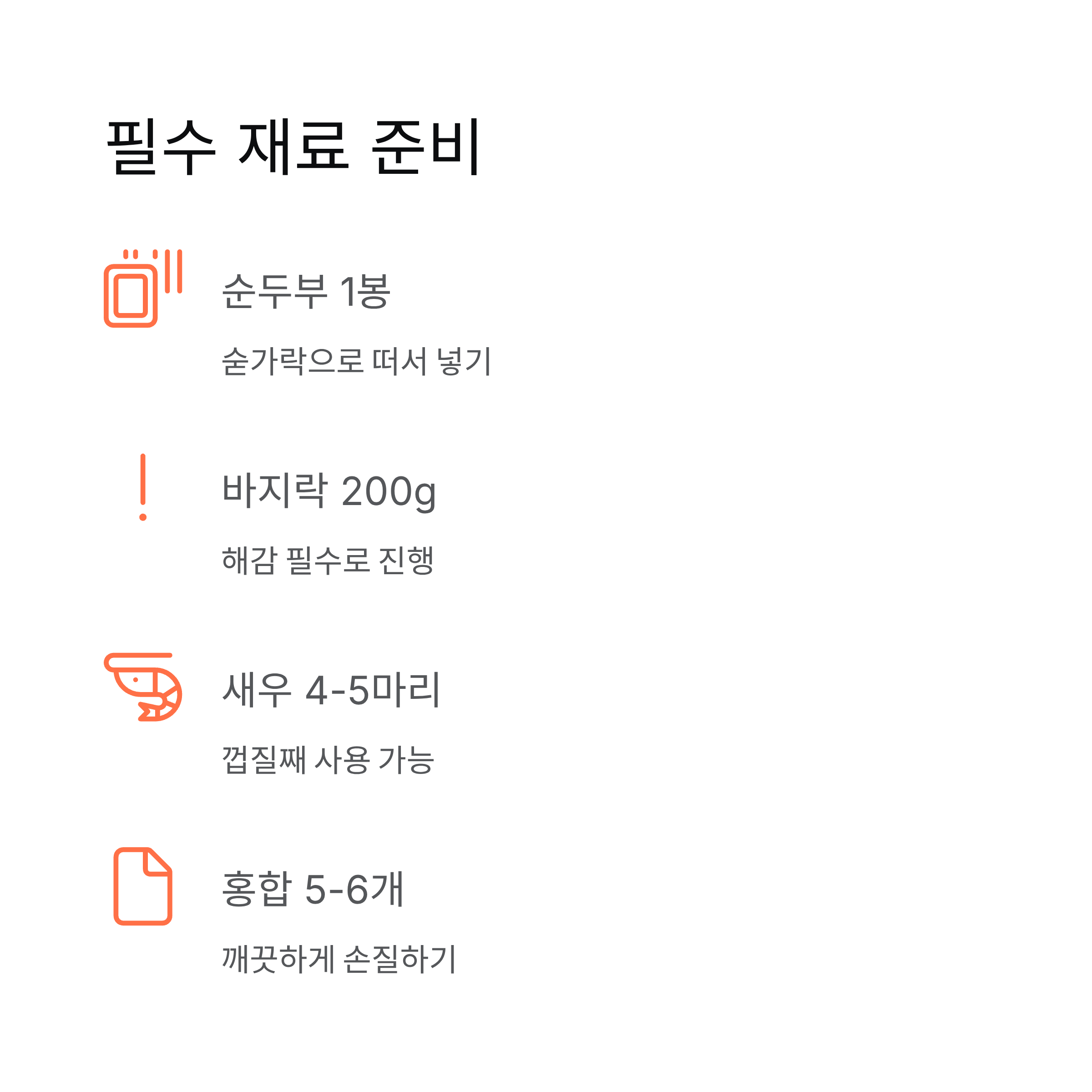 | 새우 | 4~5마리 | 껍질째 사용 가능 |