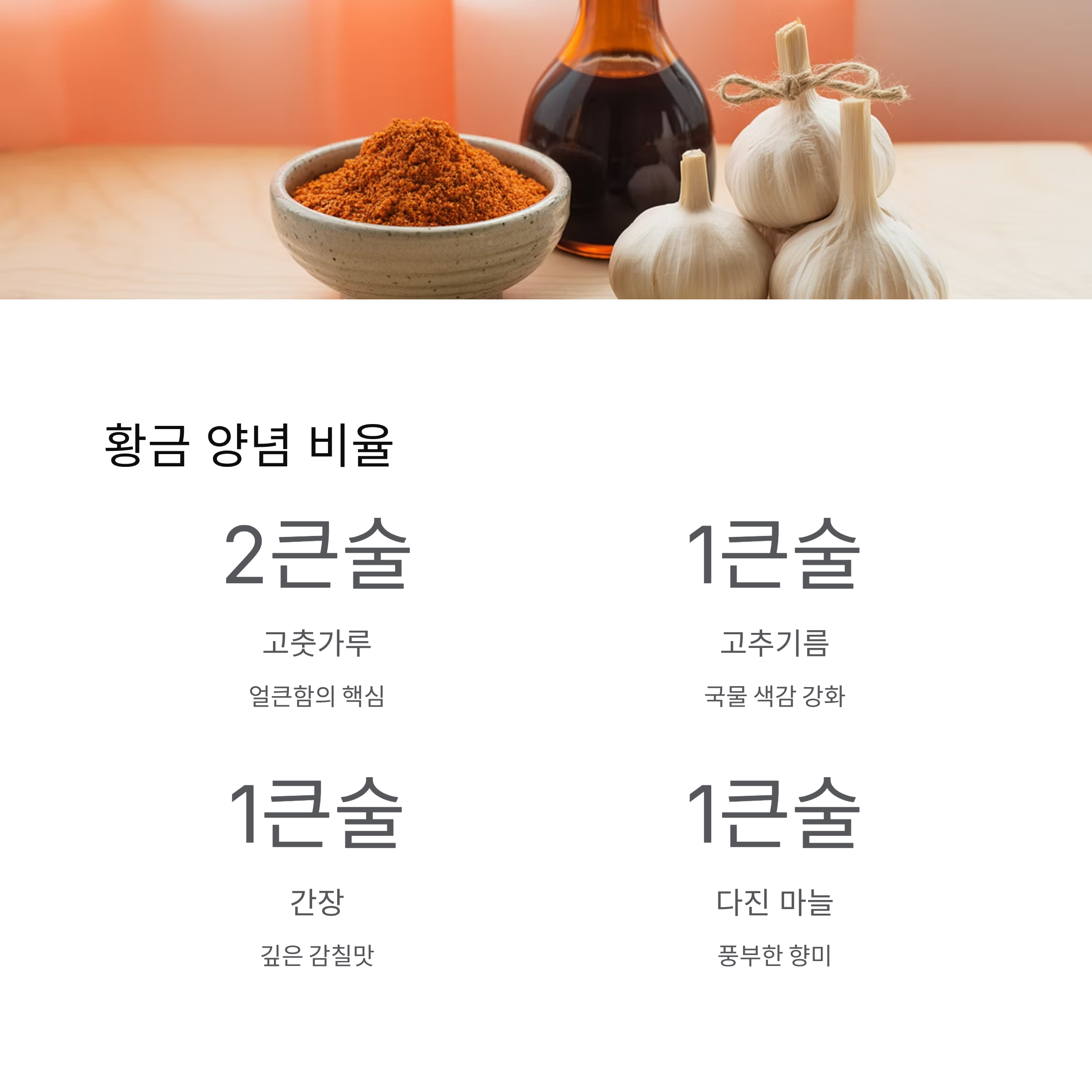 | 고추기름 | 1큰술 | 국물 색감 강화 |
