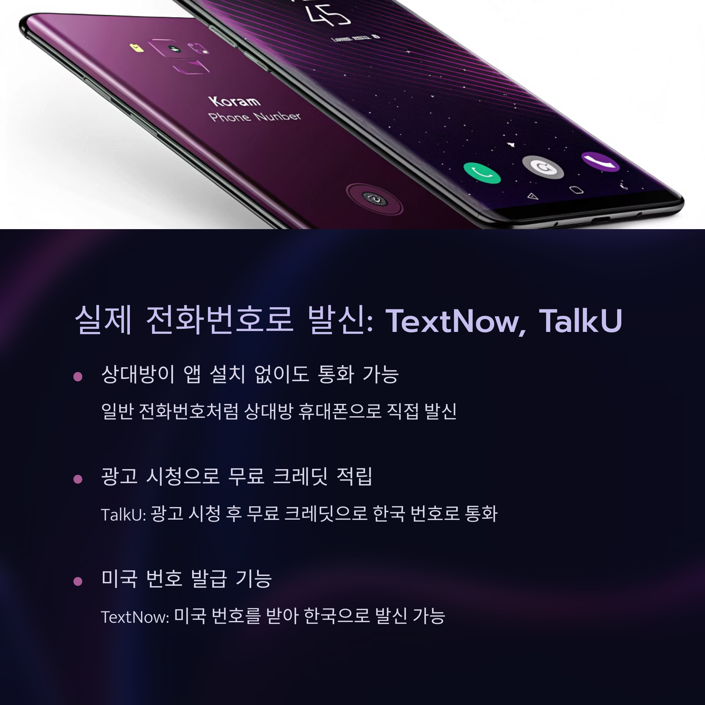 TextNow | 미국 번호 발급, 한국 번호로 발신 가능 | VPN 필요 시 있음 |