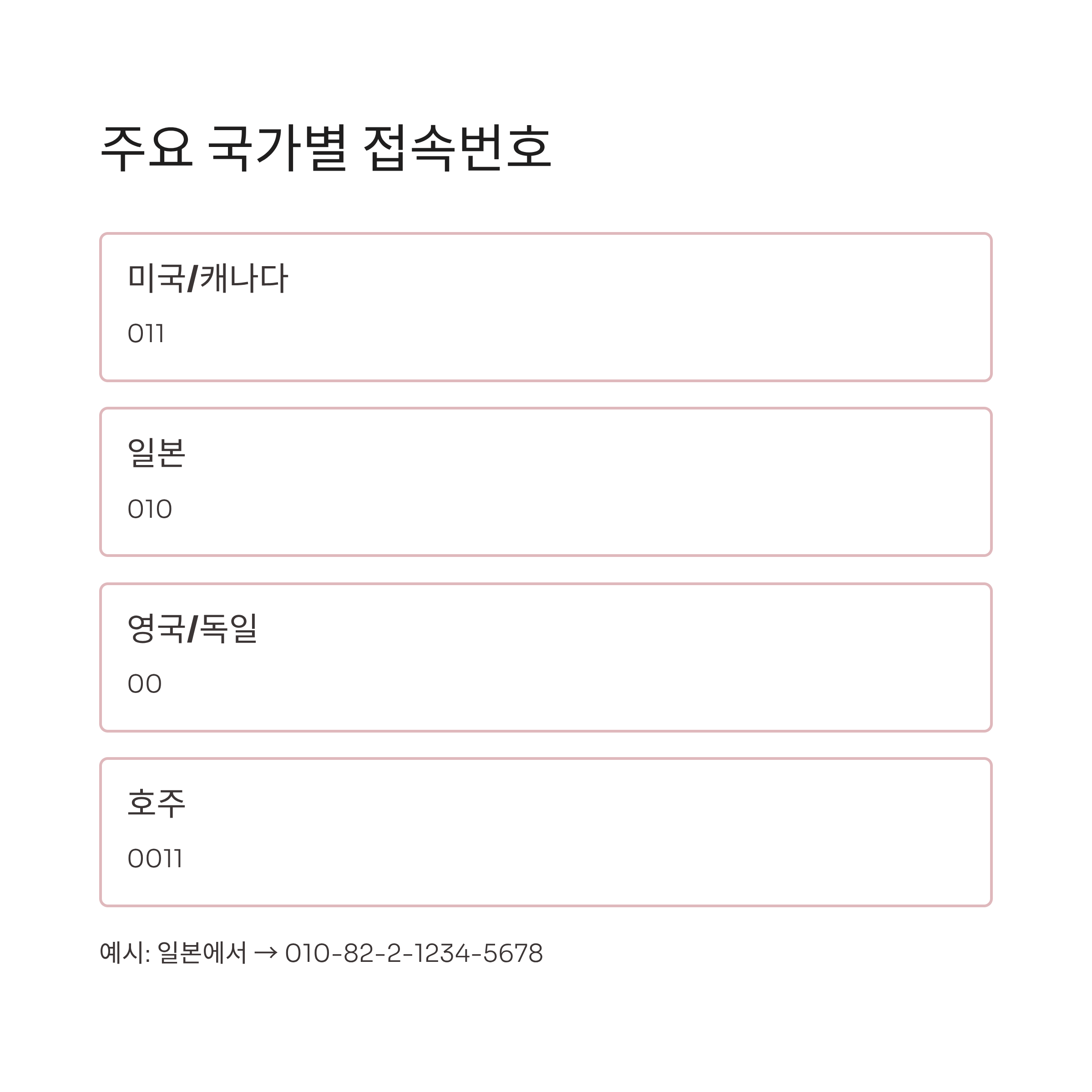 예: 일본에서 02-1234-5678로 전화할 경우 → 010-82-2-1234-5678