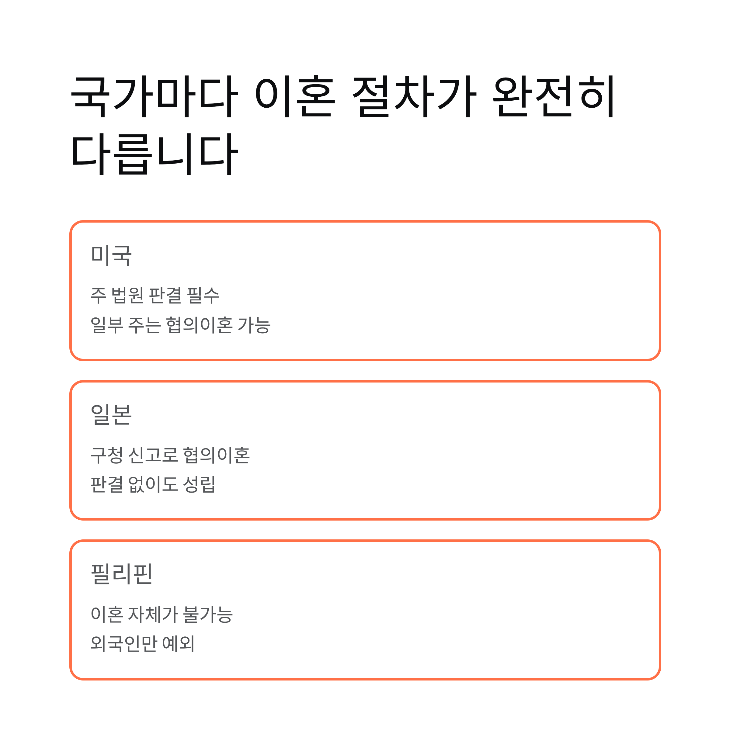 | 미국 | 주 법원 판결 필요 | 일부 주는 협의이혼도 가능 |