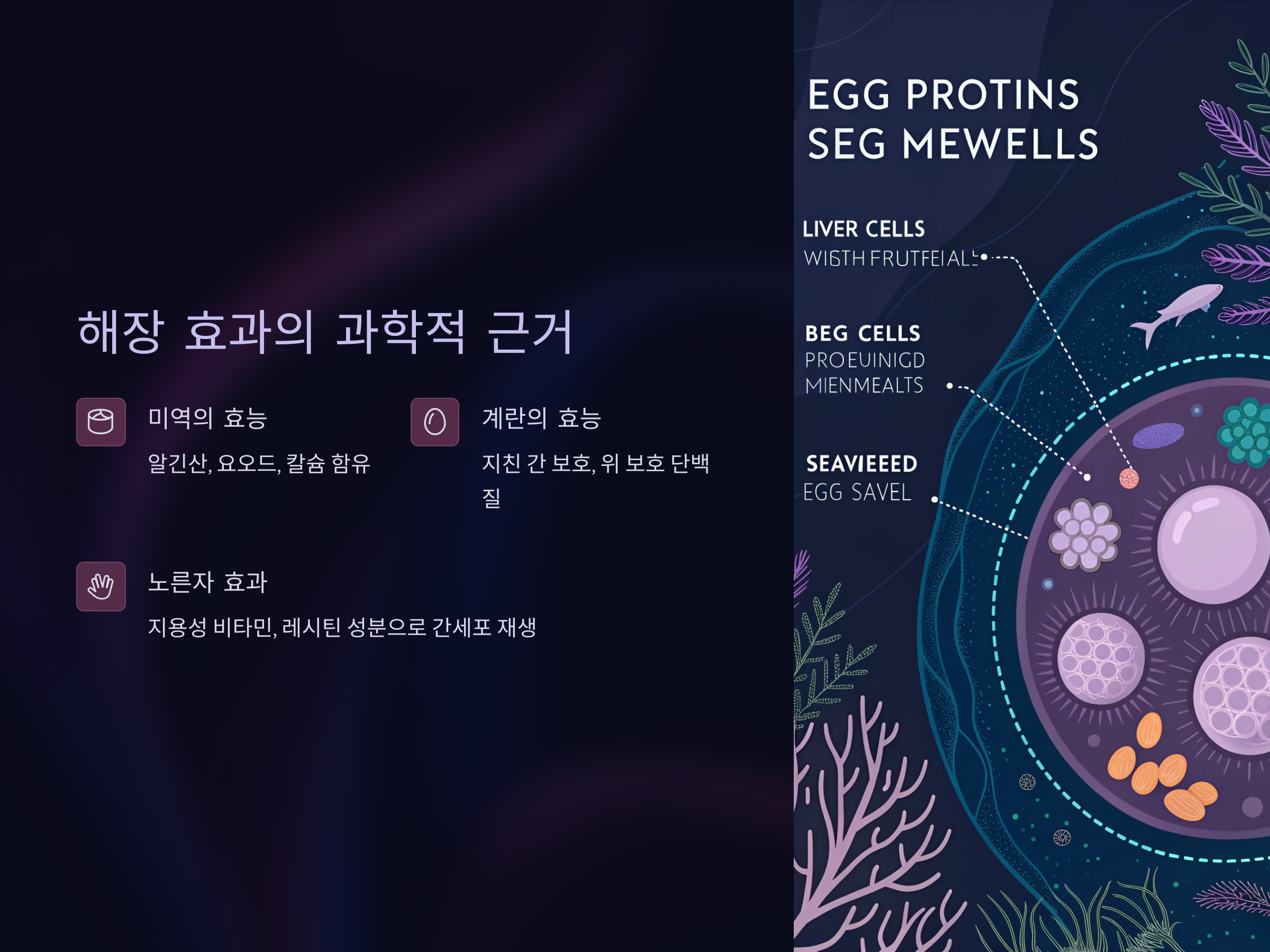 미역에는 알긴산과 요오드, 칼슘, 마그네슘 등 숙취 해소와 간 기능 회복에 도움이 되는 미네랄 성분이 풍부하게 들어 있습니다.